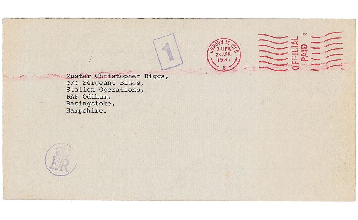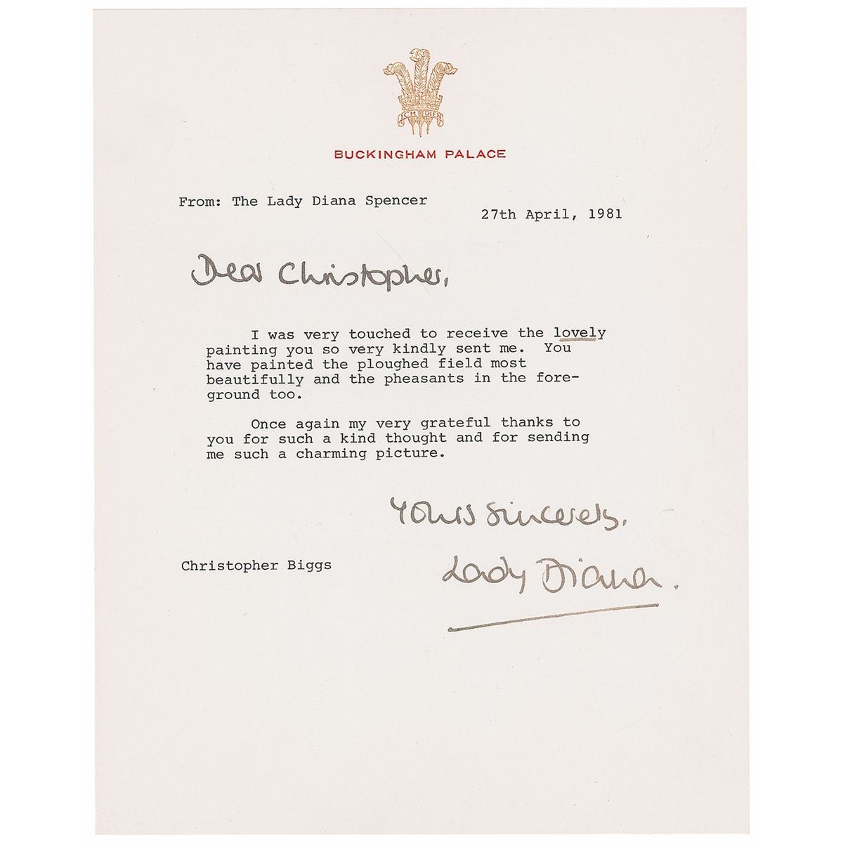 TLS signed “Yours sincerely, Lady Diana,” one page, 7.25 x 9.25, Buckingham Palace letterhead, April 27, 1981. Letter to Christopher Biggs, in full: “I was very touched to receive the lovely painting you so very kindly sent me. You have painted the ploughed field most beautifully and the pheasants in the foreground too. Once again my very grateful thanks to you for such a kind thought and for sending me such a charming picture.” Diana also adds “Dear Christopher” in her own hand and underlines the word ‘lovely.’ In fine condition. Accompanied by the original mailing envelope, and copies of two related letters, one from Diana’s private secretary Oliver Everett, extending further thanks, and the other from Anne Pitcher, a tutor at Aldershot’s Cambridge Military Hospital, sharing further background information on the painting. Following Prince Charles’s proposal to Diana on February 24, 1981, Pitcher enlisted the help of Biggs, an 11-year-old disabled boy in her ward, to assist in making the soon-to-be royal couple an engagement present, a painting entitled ‘Love in a Ploughed Field,’ symbolizing the moment the pair had originally met. A charming letter composed just three months before the ‘the wedding of the century,’ greatly enhanced by its lovely backstory and the rare inclusion of her title as “Lady Diana.”