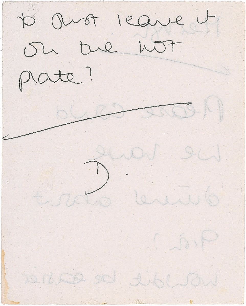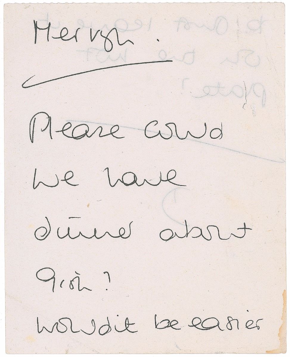ANS signed “D.,” one page, 4.5 x 5.5, no date. Note to her personal chef Mervyn Wycherley. In full: “Please could we have dinner about 9ish? Would it be easier to just leave it on the hot plate?” In fine condition, with light creasing.