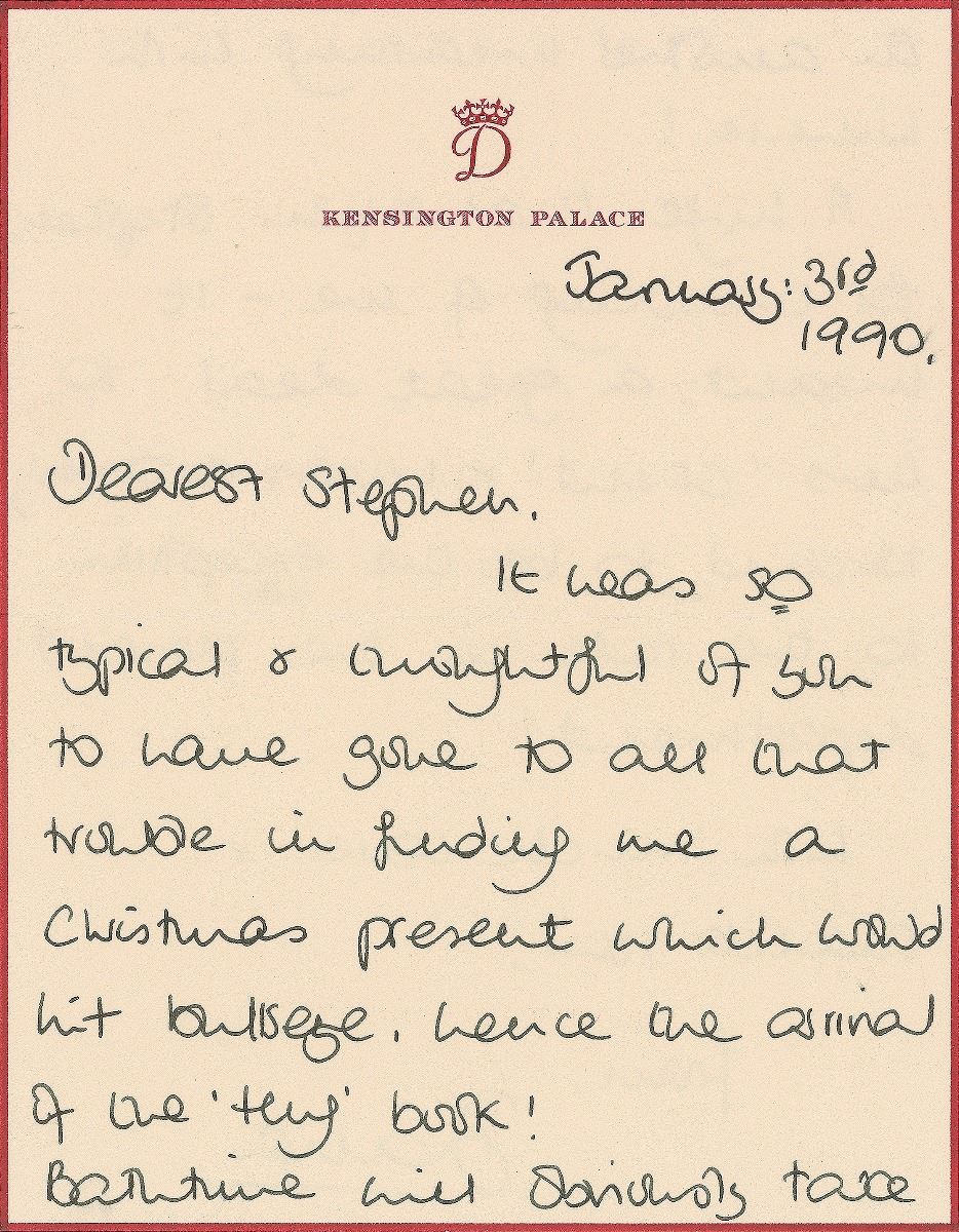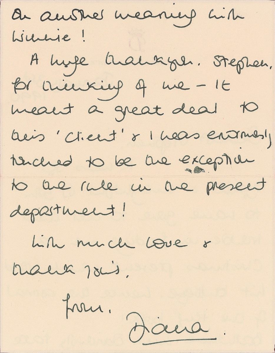 ALS signed “Diana,” one page both sides, 6.25 x 8, monogrammed Kensington Palace letterhead, January 30, 1990. Letter of thanks to Stephen Twigg for a Christmas gift. In full: “It was so typical & thoughtful of you to have gone to all that trouble in finding me a Christmas present which would hit the bullseye, hence the arrival of the I-Ching book! Bath time will obviously take on another meaning with Winnie! A huge thank you, Stephen, for thinking of me—It meant a great deal to this ‘client’ & I was enormously touched to be the exception to the rule in the present department!” In fine condition. Accompanied by the original mailing envelope addressed in her own hand.