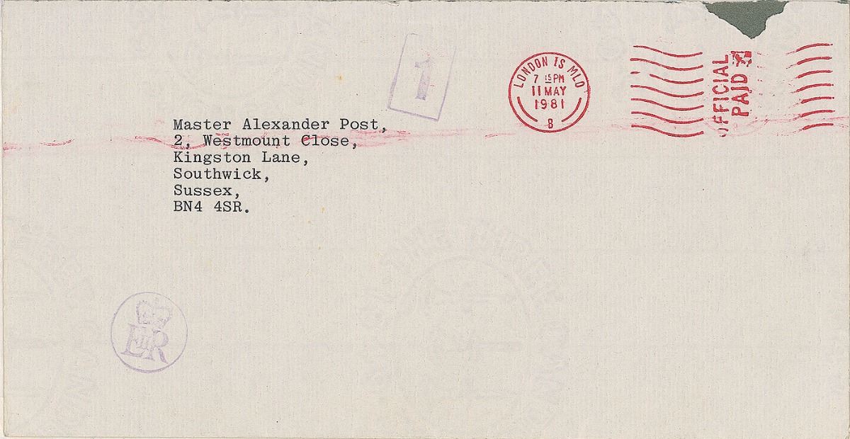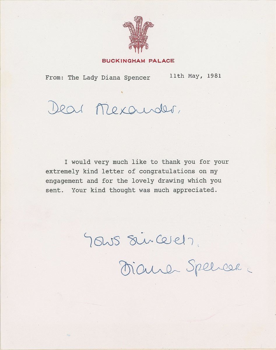 TLS signed “Yours sincerely, Diana Spencer,” one page, 7.25 x 9.25, Buckingham Palace letterhead, May 11, 1981. Letter to Alexander Post, in full: “I would very much like to thank you for your extremely kind letter of congratulations on my engagement and for the lovely drawing which you sent. Your kind thought was much appreciated.” Diana has added the salutation in her own hand. In fine condition, with tape along the perimeter of the reverse affecting nothing. Accompanied by the original mailing envelope. A sought-after letter boasting the scarce addition of Diana’s maiden name.