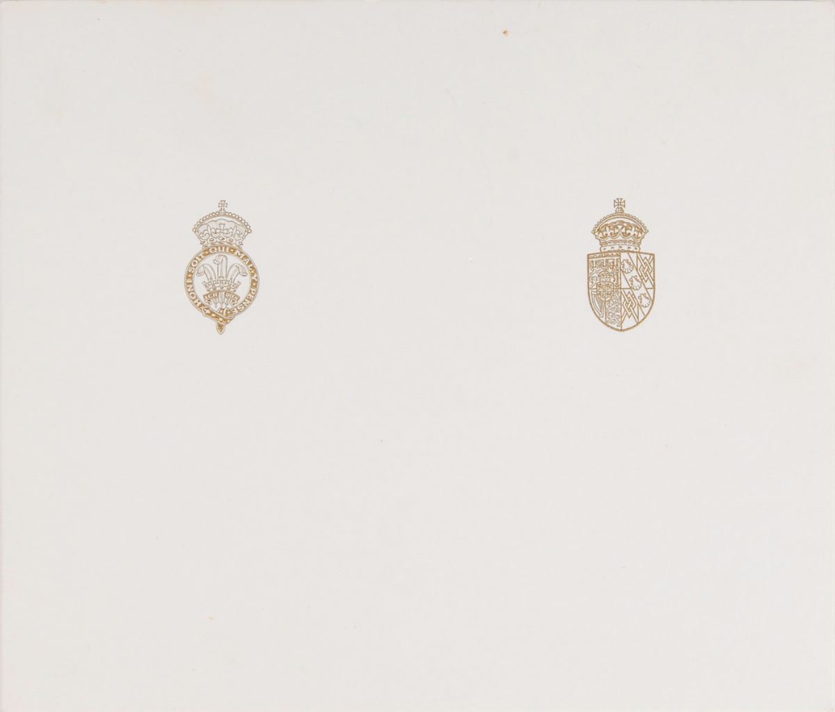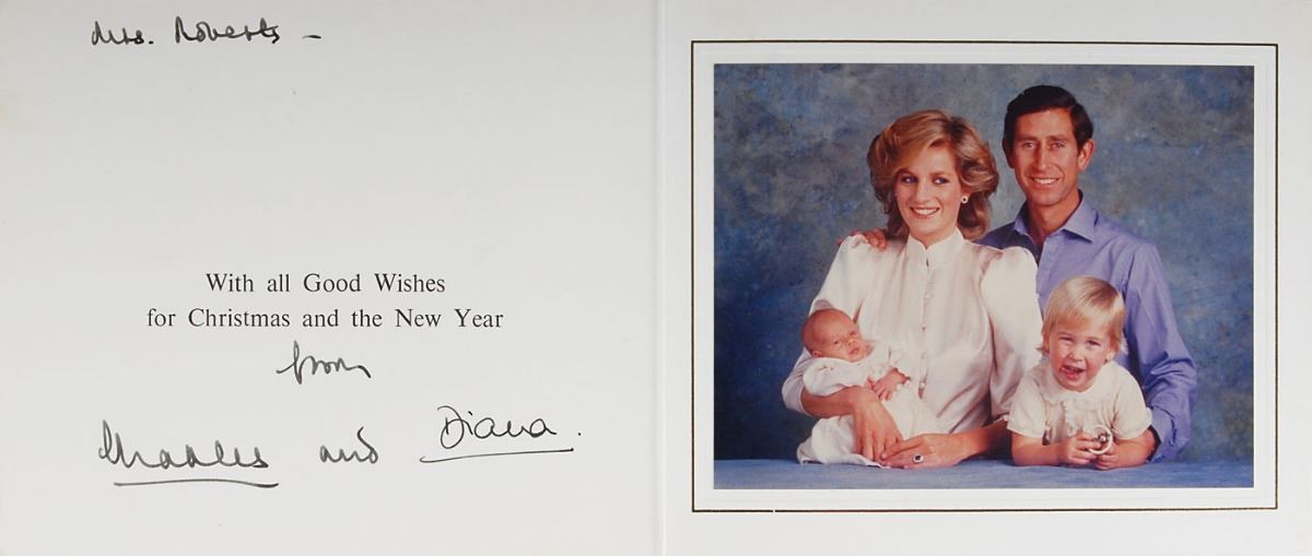 Royal Christmas card from 1984, measuring 14 x 6 open, featuring an affixed color photo of the family with newborn Prince Harry, signed and inscribed inside in ink, “Mrs. Roberts—from Charles and” and “Diana.” In fine condition. Accompanied by the original mailing envelope.