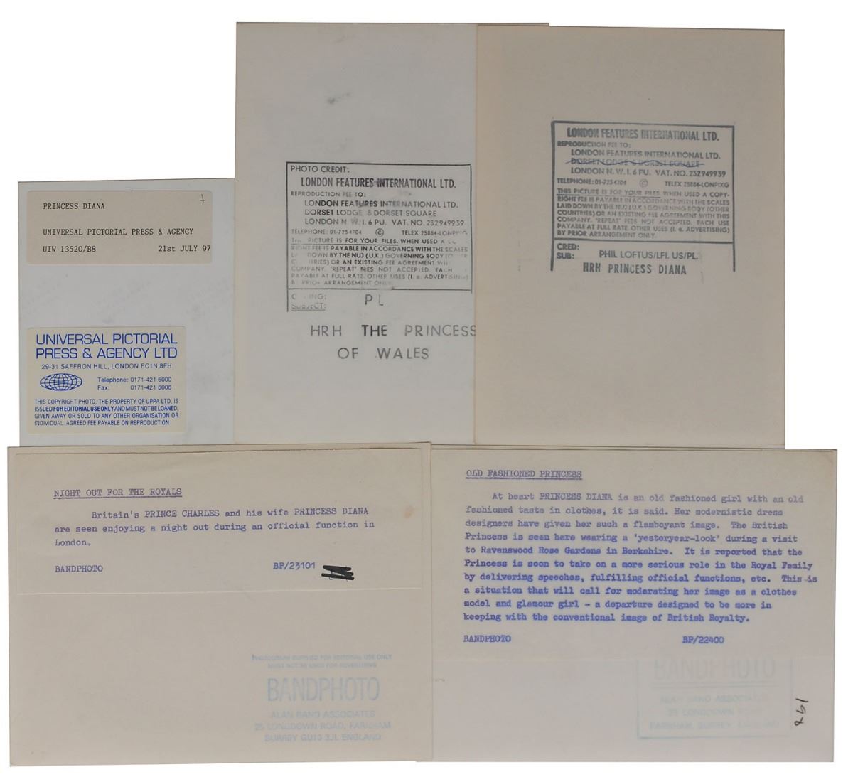 Five glossy press photos of Princess Diana in various poses, ranging in size from 5 x 7 to 6 x 8, four showing her alone and one of her with Prince Charles. All bearing press stamps on the reverse. In overall fine condition.