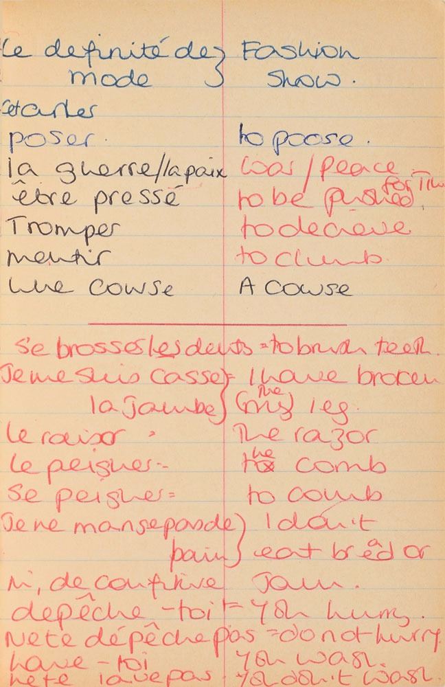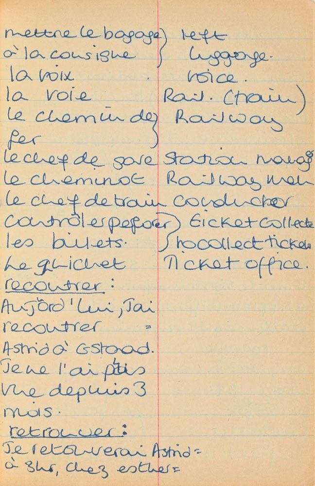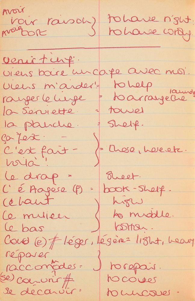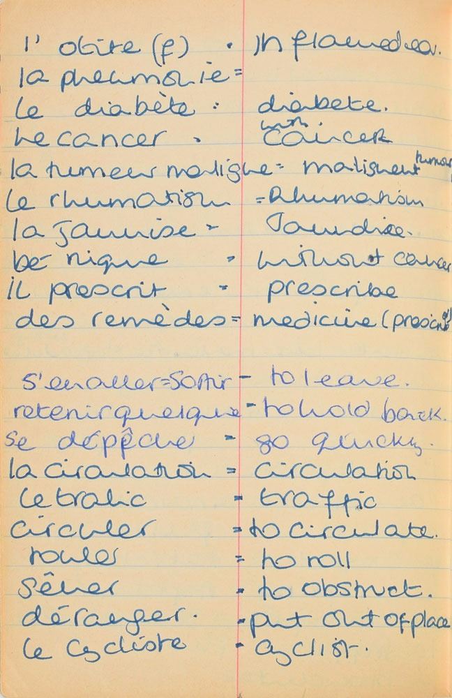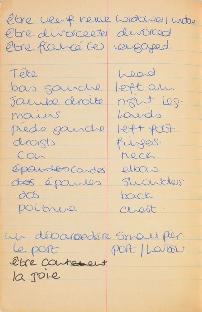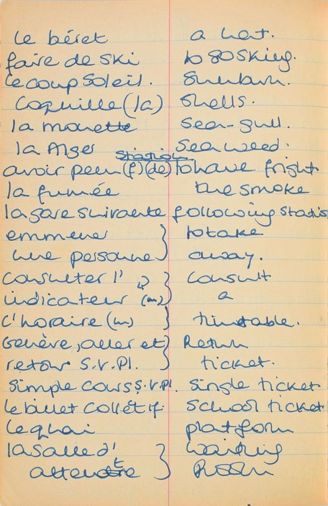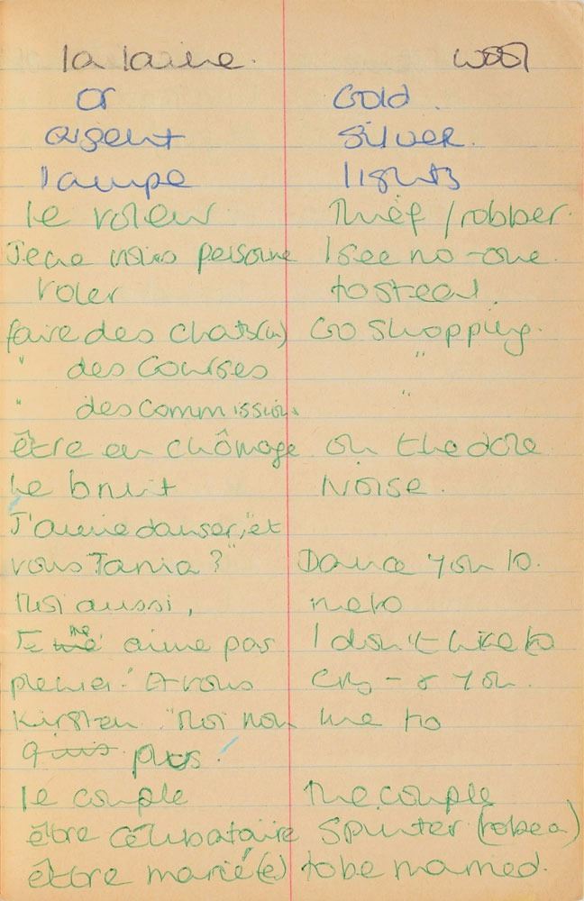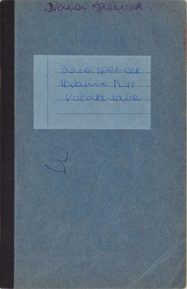 Remarkable circa 1978 handwritten French vocabulary notebook from her time at Swiss finishing school, 4.25 x 6.75, marked on the front cover in her own hand in blue ink, "Diana Spencer, Madame Fowls Vocabulaire," and in purple ink, "Diana Spencer." Inside are 21 full pages of Diana's handwritten notes (nearly all double-sided), plus a couple of additional lines, consisting of translations of vocab words and phrases from French to English. In fine condition. Accompanied by a letter of provenance from Sally Fell, the head chef at Althorp, in part: "I was employed as head chef at Althorp House during the 1980s when Diana, Princess of Wales, was a regular visitor. During this period Raine Spencer was in the process of totally redecorating Althorp in her own style. As Diana now permanently resided in London, one of the rooms listed for redecoration was her old bedroom and the butler at the time, Carl Ackerman, was instructed to remove all of Diana's belongings and offer them to the staff, or dispose of them if no interest was shown. All the items were placed on a long table in the courtyard, and we the staff were invited to take what we wished, which is how I came to possess Diana's French vocabulary school book." We know of only one other example of Diana's schoolbooks to be held in private hands. Diana attended Institut Alpin Videmanette, a finishing school in Rougemont, Switzerland, for one term in 1977–1978. It was during this period that she was first introduced to Prince Charles, who was dating her older sister Sarah. Their relationship lasted only briefly before dissolving over some of Sarah's comments reported in the gossip columns. Diana and Charles's relationship blossomed in 1980, and they got married in 1981. A truly remarkable Diana piece, filled with her teenage handwriting.