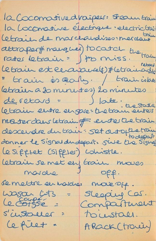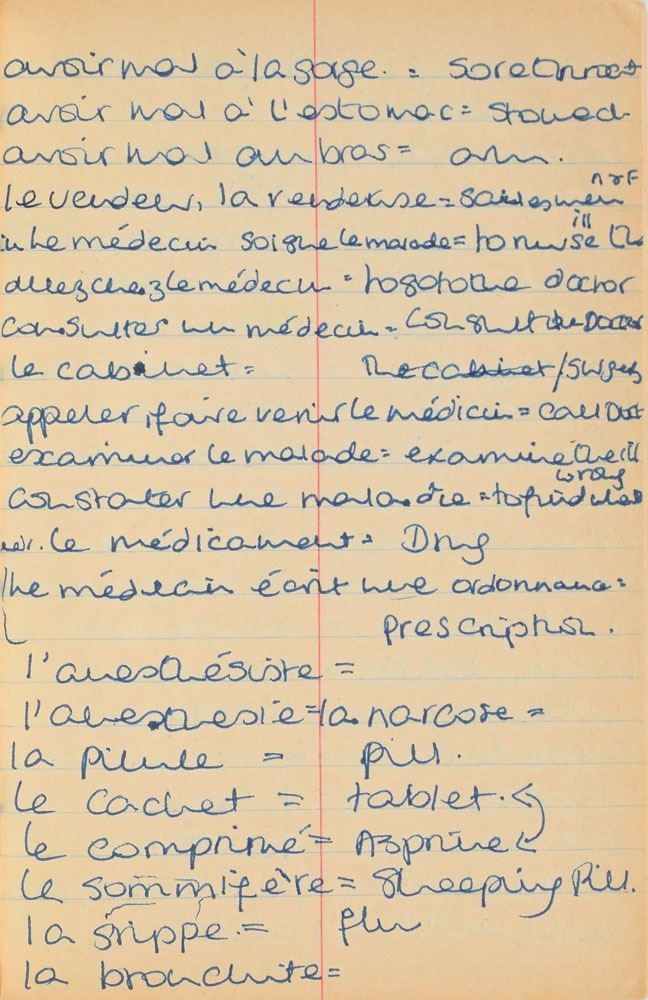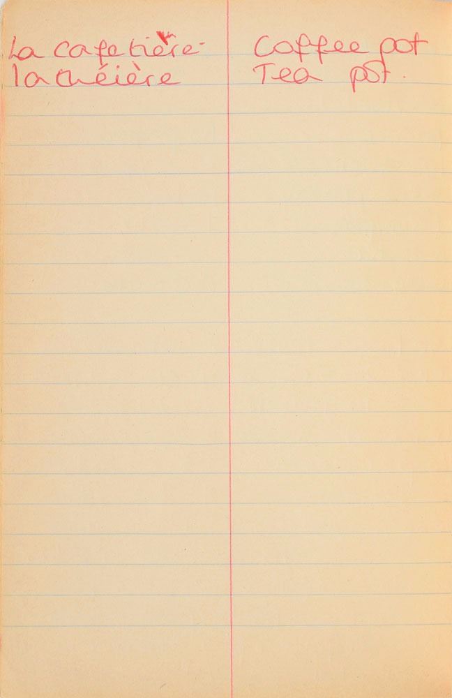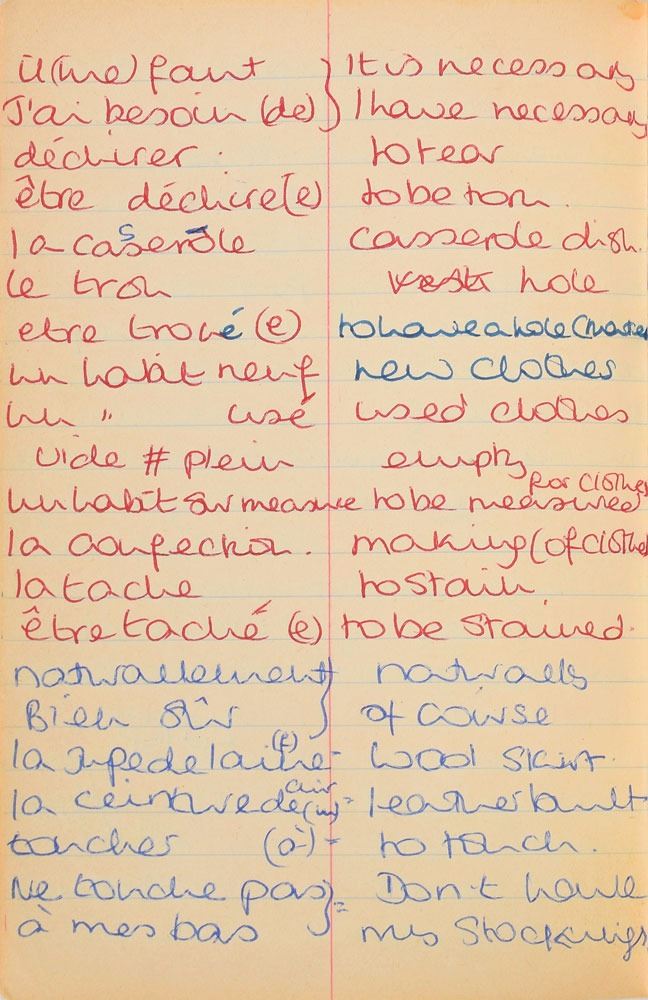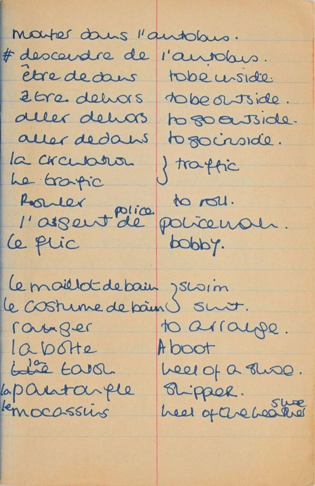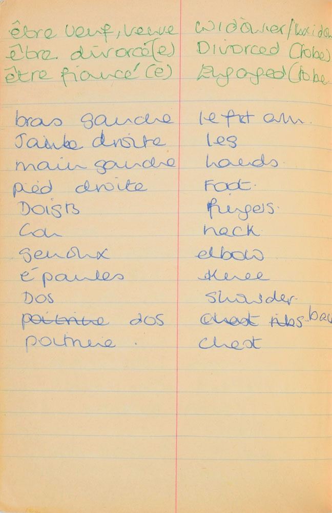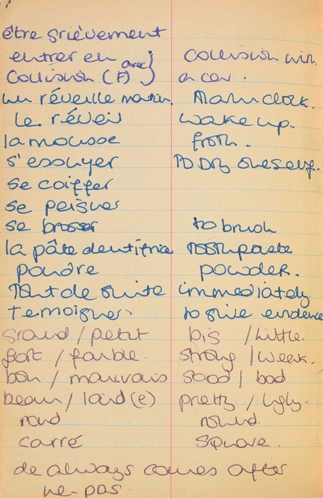 Remarkable circa 1978 handwritten French vocabulary notebook from her time at Swiss finishing school, 4.25 x 6.75, marked on the front cover in her own hand in blue ink, "Diana Spencer, Madame Fowls Vocabulaire," and in purple ink, "Diana Spencer." Inside are 21 full pages of Diana's handwritten notes (nearly all double-sided), plus a couple of additional lines, consisting of translations of vocab words and phrases from French to English. In fine condition. Accompanied by a letter of provenance from Sally Fell, the head chef at Althorp, in part: "I was employed as head chef at Althorp House during the 1980s when Diana, Princess of Wales, was a regular visitor. During this period Raine Spencer was in the process of totally redecorating Althorp in her own style. As Diana now permanently resided in London, one of the rooms listed for redecoration was her old bedroom and the butler at the time, Carl Ackerman, was instructed to remove all of Diana's belongings and offer them to the staff, or dispose of them if no interest was shown. All the items were placed on a long table in the courtyard, and we the staff were invited to take what we wished, which is how I came to possess Diana's French vocabulary school book." We know of only one other example of Diana's schoolbooks to be held in private hands. Diana attended Institut Alpin Videmanette, a finishing school in Rougemont, Switzerland, for one term in 1977–1978. It was during this period that she was first introduced to Prince Charles, who was dating her older sister Sarah. Their relationship lasted only briefly before dissolving over some of Sarah's comments reported in the gossip columns. Diana and Charles's relationship blossomed in 1980, and they got married in 1981. A truly remarkable Diana piece, filled with her teenage handwriting.