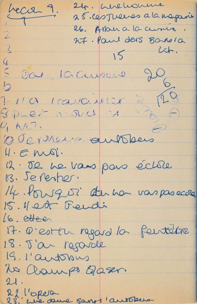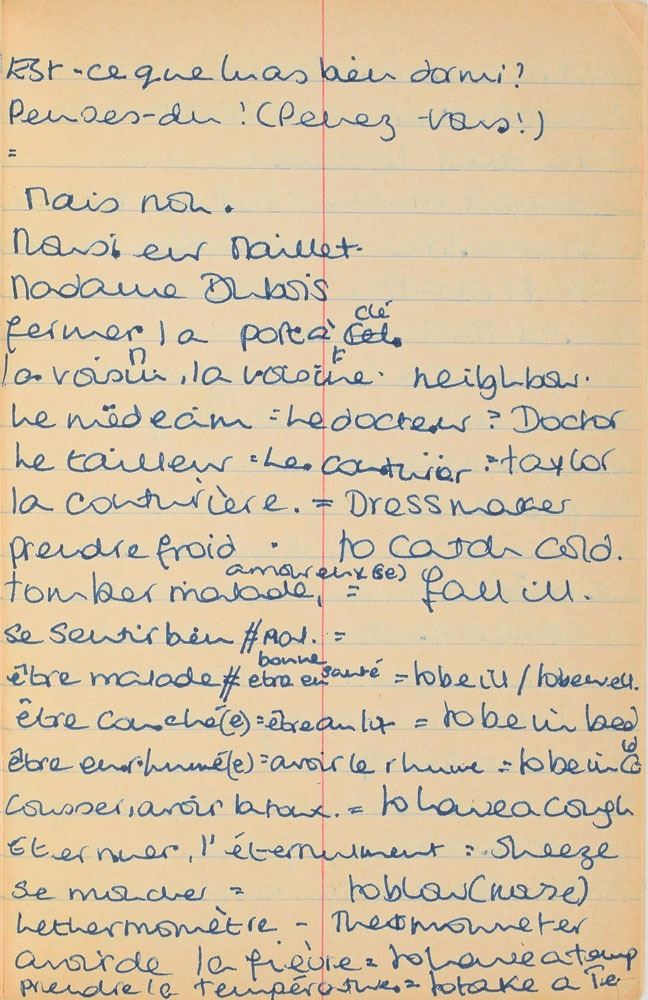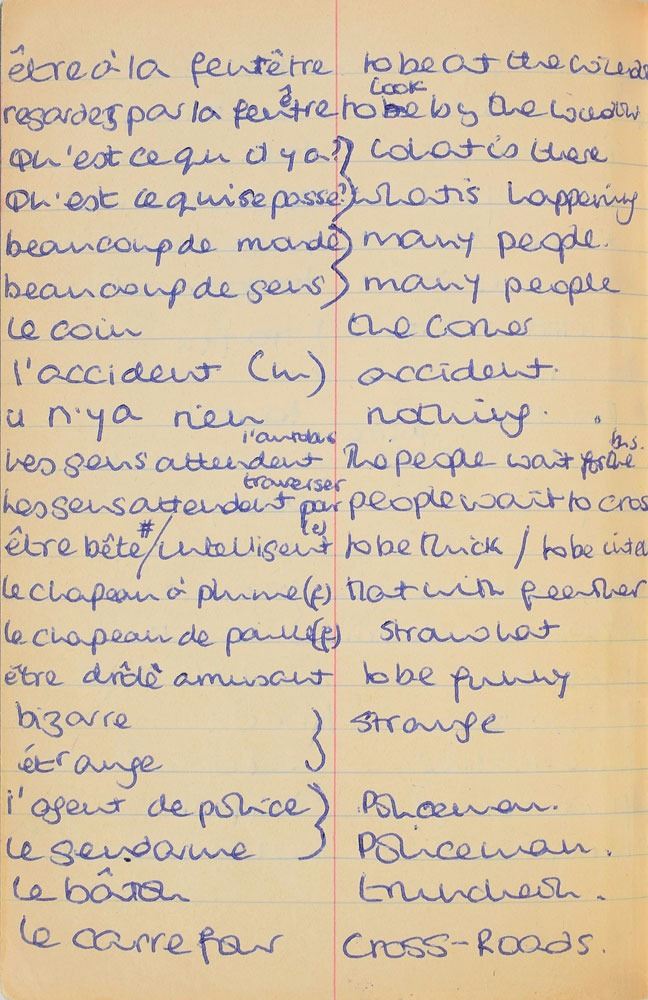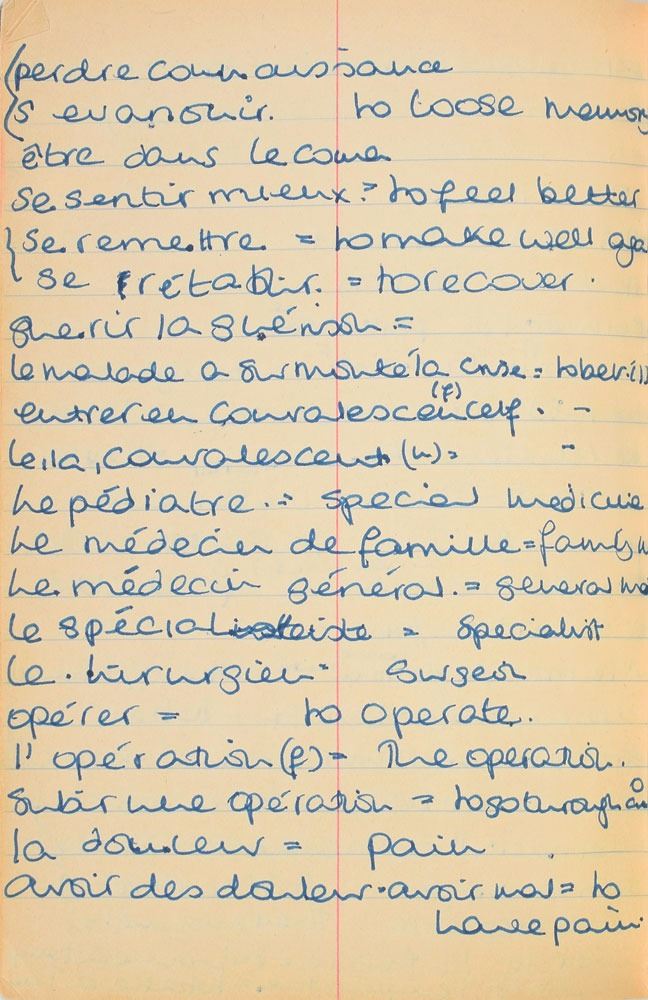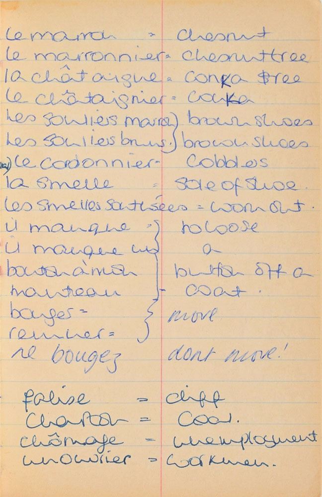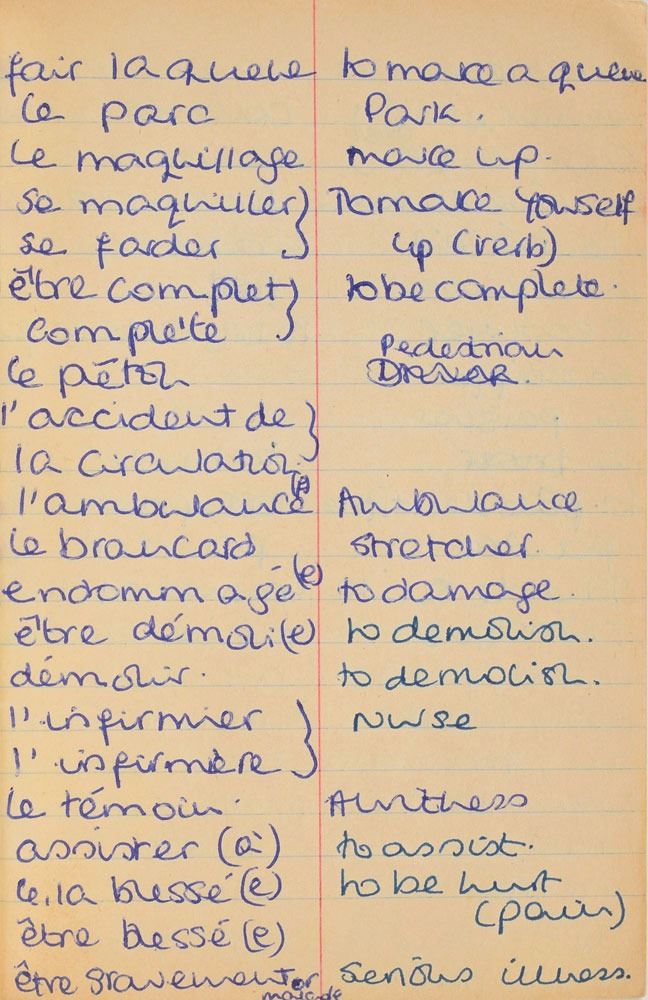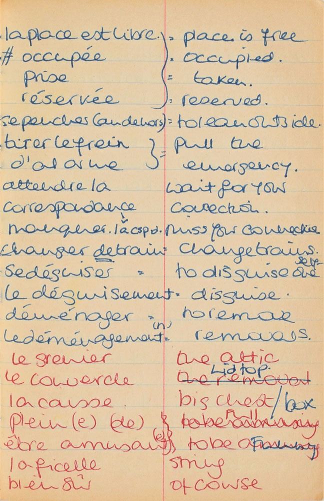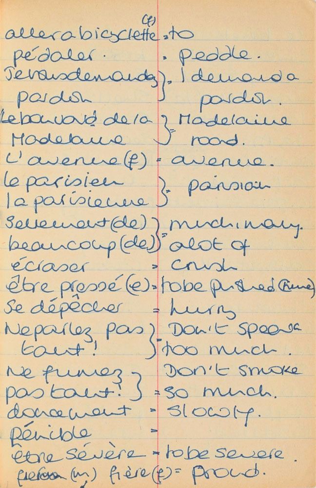 Remarkable circa 1978 handwritten French vocabulary notebook from her time at Swiss finishing school, 4.25 x 6.75, marked on the front cover in her own hand in blue ink, "Diana Spencer, Madame Fowls Vocabulaire," and in purple ink, "Diana Spencer." Inside are 21 full pages of Diana's handwritten notes (nearly all double-sided), plus a couple of additional lines, consisting of translations of vocab words and phrases from French to English. In fine condition. Accompanied by a letter of provenance from Sally Fell, the head chef at Althorp, in part: "I was employed as head chef at Althorp House during the 1980s when Diana, Princess of Wales, was a regular visitor. During this period Raine Spencer was in the process of totally redecorating Althorp in her own style. As Diana now permanently resided in London, one of the rooms listed for redecoration was her old bedroom and the butler at the time, Carl Ackerman, was instructed to remove all of Diana's belongings and offer them to the staff, or dispose of them if no interest was shown. All the items were placed on a long table in the courtyard, and we the staff were invited to take what we wished, which is how I came to possess Diana's French vocabulary school book." We know of only one other example of Diana's schoolbooks to be held in private hands. Diana attended Institut Alpin Videmanette, a finishing school in Rougemont, Switzerland, for one term in 1977–1978. It was during this period that she was first introduced to Prince Charles, who was dating her older sister Sarah. Their relationship lasted only briefly before dissolving over some of Sarah's comments reported in the gossip columns. Diana and Charles's relationship blossomed in 1980, and they got married in 1981. A truly remarkable Diana piece, filled with her teenage handwriting.