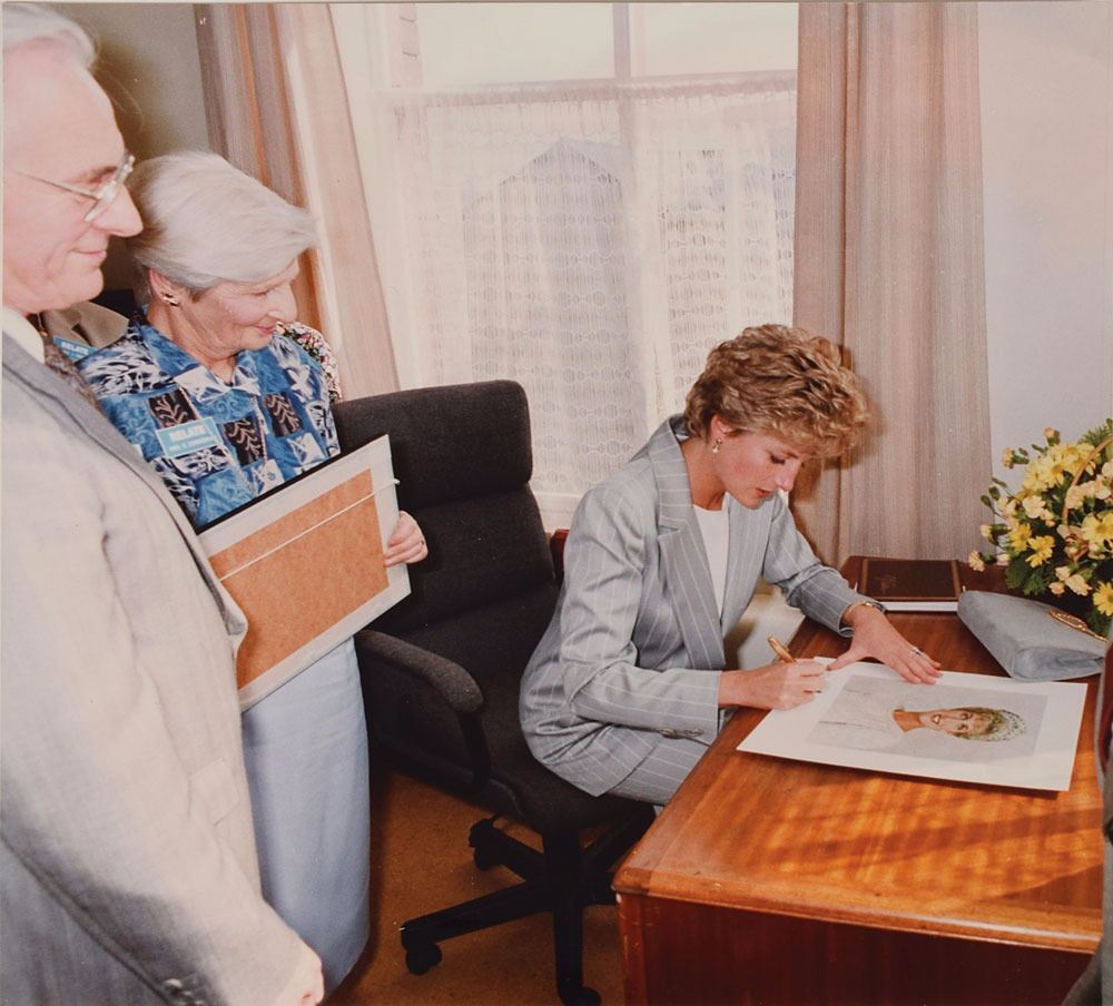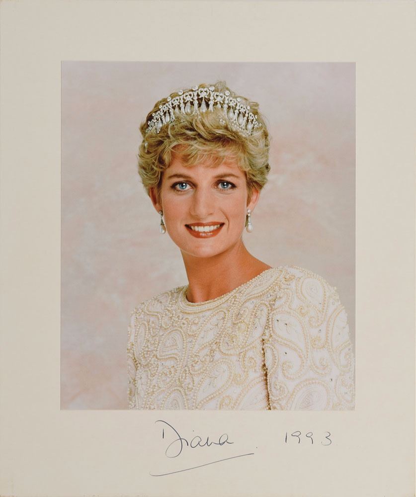 Beautiful color satin-finish 10 x 12 photo of Princess Diana wearing her tiara, affixed to its original 14 x 17 mount, prominently signed on the mount in black ink, "Diana, 1993." In very fine condition. Accompanied by a photo of Princess Diana signing this exact photograph. An absolutely breathtaking signed photo in an unusually large size.