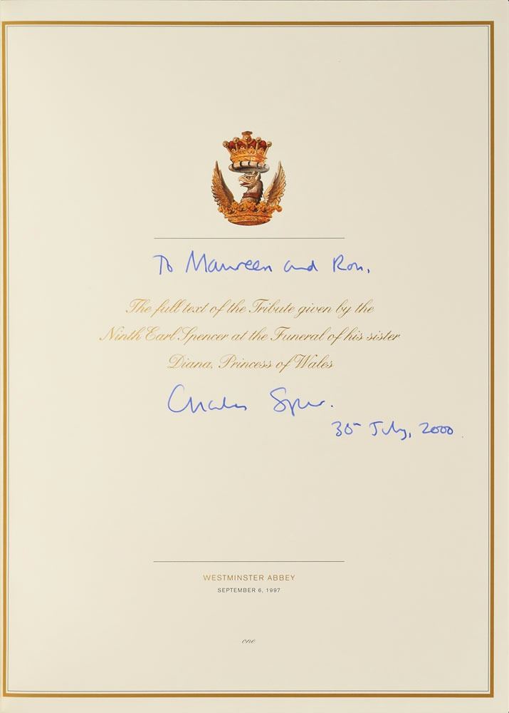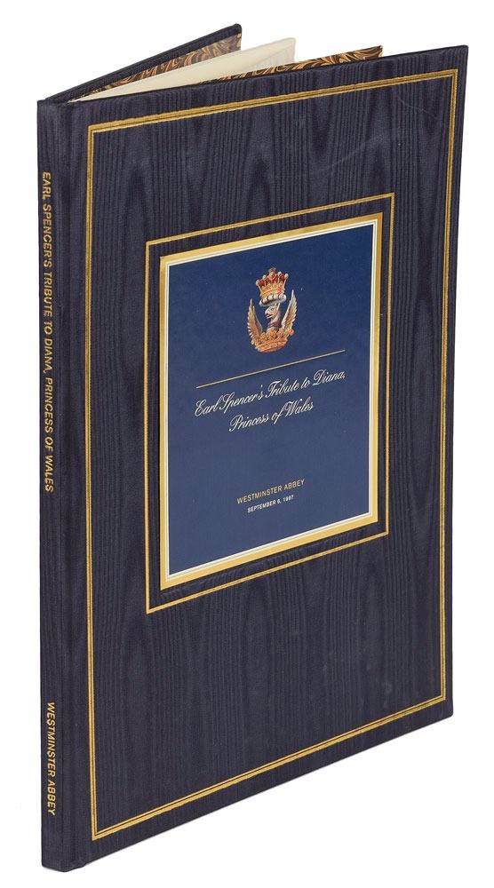 Signed book: Earl Spencer's Tribute to Diana Princess of Wales. England: Althorp, 1997. Silk-bound hardcover, 8 x 10.75, 25 pages. Signed and inscribed on an introductory page in ink, "To Maureen and Ron, Charles Spencer, 30th July, 2000." Includes the original Althorp presentation box. In fine condition, with a few light stains and split corners to the box.