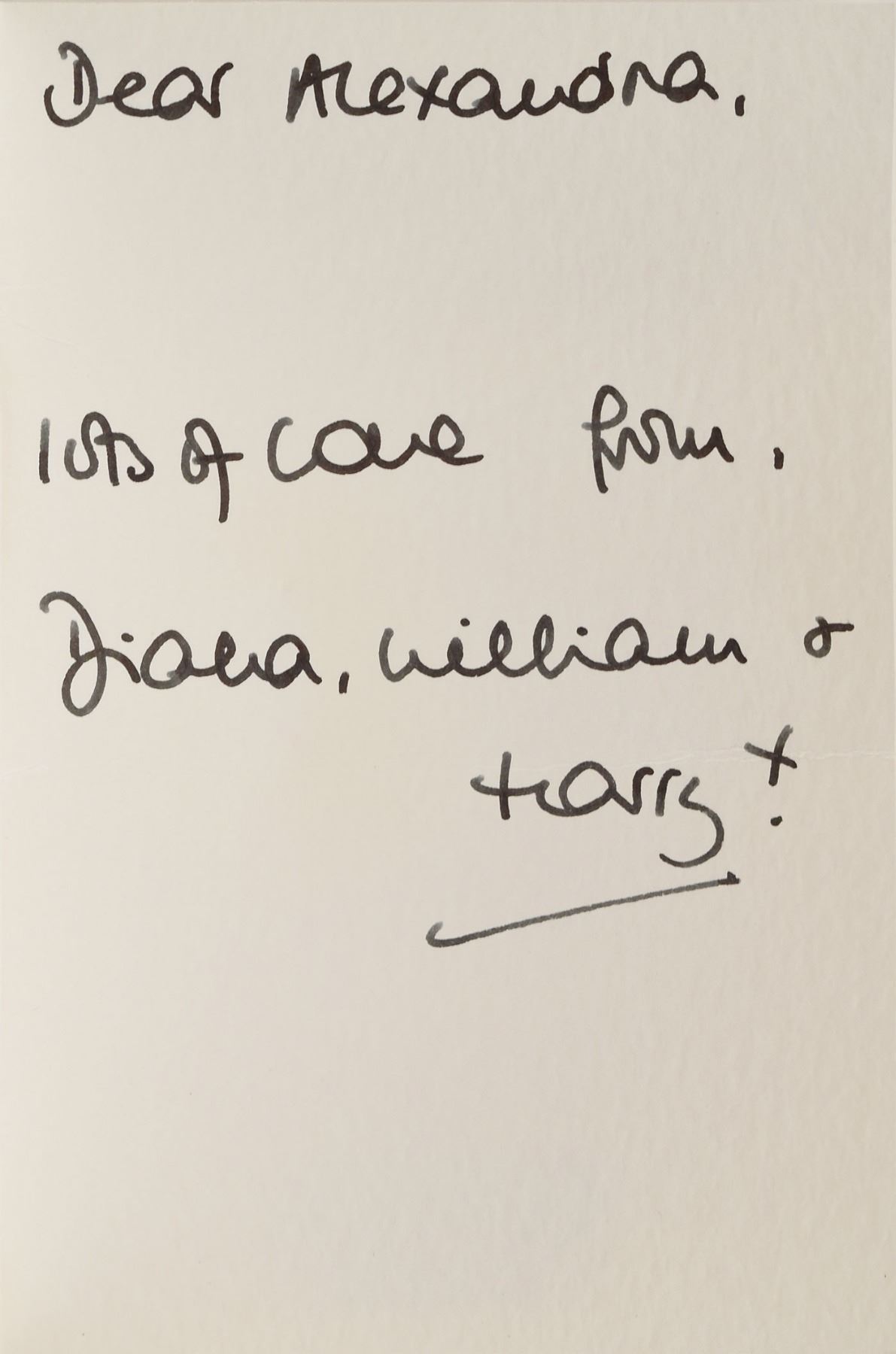 Handmade Valentine's Day card by Jack and Jill of England featuring a wooden bear on the front, 4 x 6, signed and inscribed inside in bold black ink by Diana, "Dear Alexandra, lots of love from, Diana, William & Harry. x." In very good condition, with a horizontal crease passing through the card, and two small cracks to the wooden bear. Accompanied by the original transmittal envelope addressed in Diana's hand, "Alexandra."