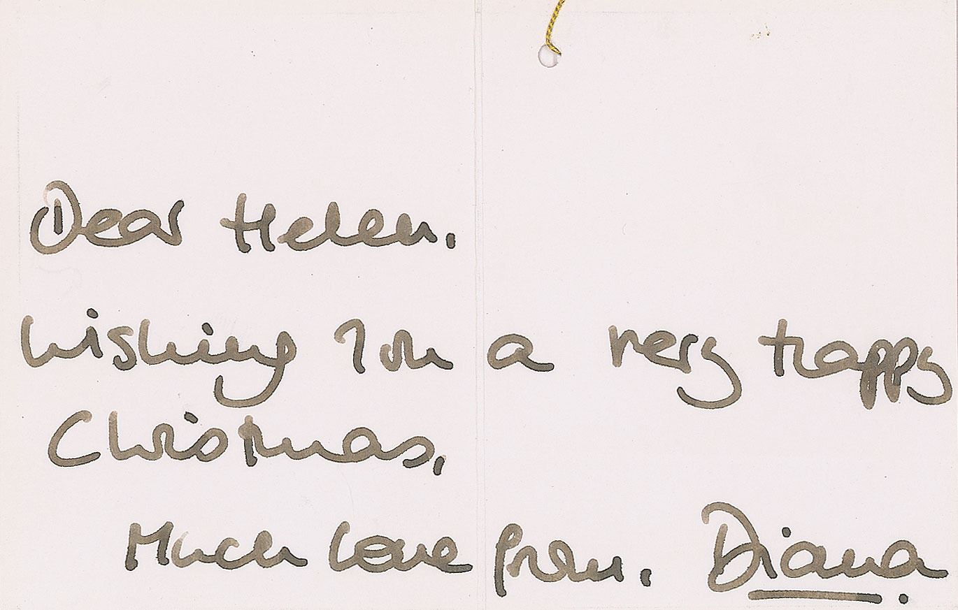 ANS penned on the inside of a 5 x 3.25 gift card, no date, in full: "Dear Helen, Wishing you a very happy Christmas, Much love from, Diana." In fine condition. Accompanied by an unsigned glossy photo and a copy of a letter of provenance from Helen Brown, who worked for Princess Diana as a secretary in her offices in St. James's Place, London.