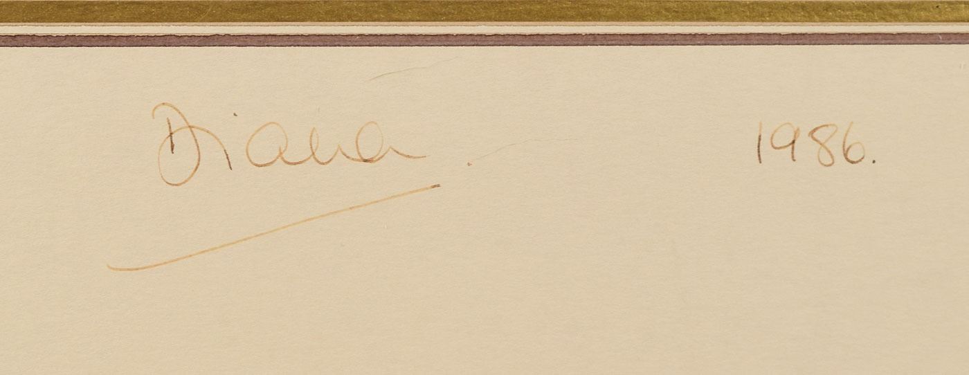 Impressive color satin-finish 15.5 x 19 close-up photo of Diana, presented in a 21.5 x 28 mat, signed on the mat in ink, "Diana, 1986." In fine condition, with faint staining to the right side of the mat, the signature a couple of shades light, and a slightly grainy quality to the image. A fantastic, imposing piece.