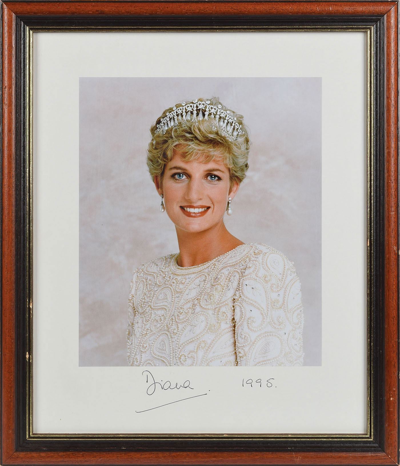 Beautiful color satin-finish 10 x 12 photo of Princess Diana wearing her tiara, affixed to its original 13.5 x 16.5 mount, prominently signed on the mount in black ink, "Diana, 1995." Framed to an overall size of 16 x 19. In very fine condition. An absolutely breathtaking signed photo in an unusually large size.