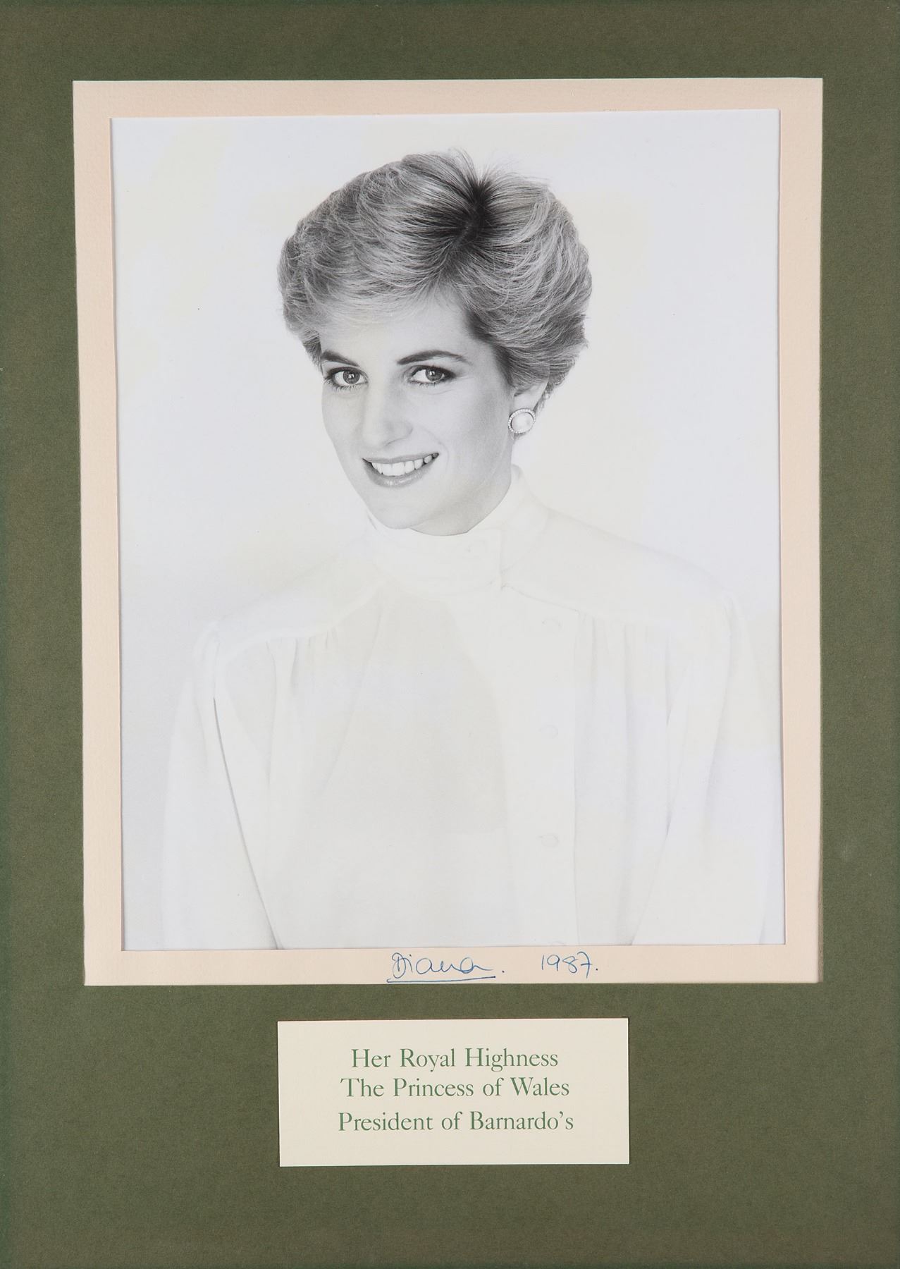 Gorgeous semi-glossy 8.5 x 10.75 head-and-shoulders portrait of Princess Diana by famed photographer Lord Snowdon, matted to an overall size of 11.75 x 16.5, signed on the mat in blue ink, "Diana, 1987." In fine condition, with faint and hardly visible discoloration to the photo. Princess Diana signed this for Barnardo's, a leading British children's charity which she served as president of from 1984 to 1996.