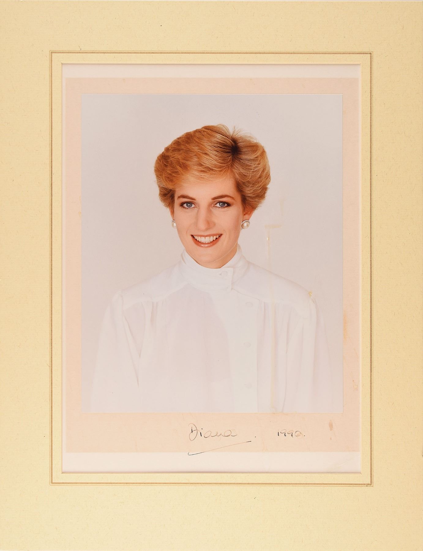 Beautiful color satin-finish 10 x 12 portrait of Princess Diana in a lovely front-facing pose, affixed to the original mount, which is signed in fountain pen, "Diana, 1990." Matted to an overall size of 16.25 x 20.75. In very good condition, with small stains and a crease to the lower right corner of the mount, two vertical creases to the image (one touching Diana's chin), slight fading to the signature, and some smearing to the right side of the image, apparently from a cleaned spill of some type; in spite of its flaws, this remains a splendid portrait of the beloved princess.