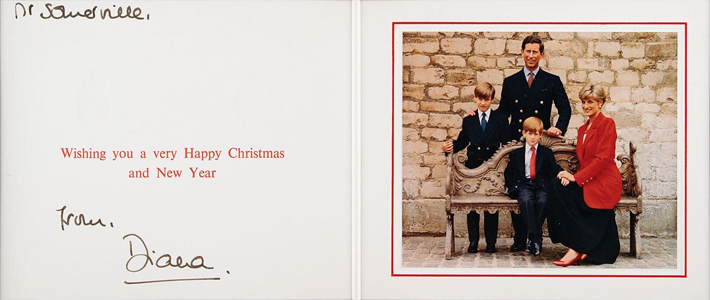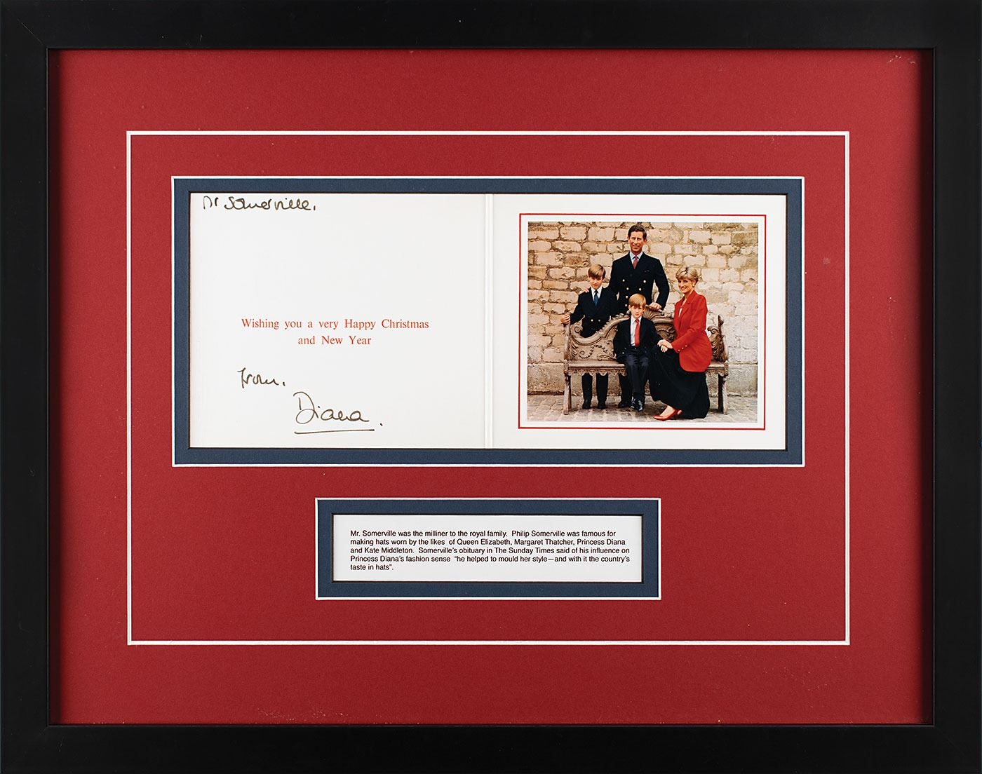 Superb Royal Christmas card from 1991, measuring 13.5 x 5.75 open, featuring a color photo of the royal family affixed inside opposite a printed holiday greeting, signed and inscribed in black felt tip to the royal milliner, "Mr. Somerville, from, Diana." Double-matted and framed with a typed caption to an overall size of 22 x 17.5. In fine condition, with a vertical crease to left edge. Philip Somerville was famous for making hats worn by the likes of Queen Elizabeth, Margaret Thatcher, Princess Diana, and Kate Middleton. His obituary in The Sunday Times said of his influence on Princess Diana's fashion sense: 'He helped to mold her style—and with it the country's taste in hats.'