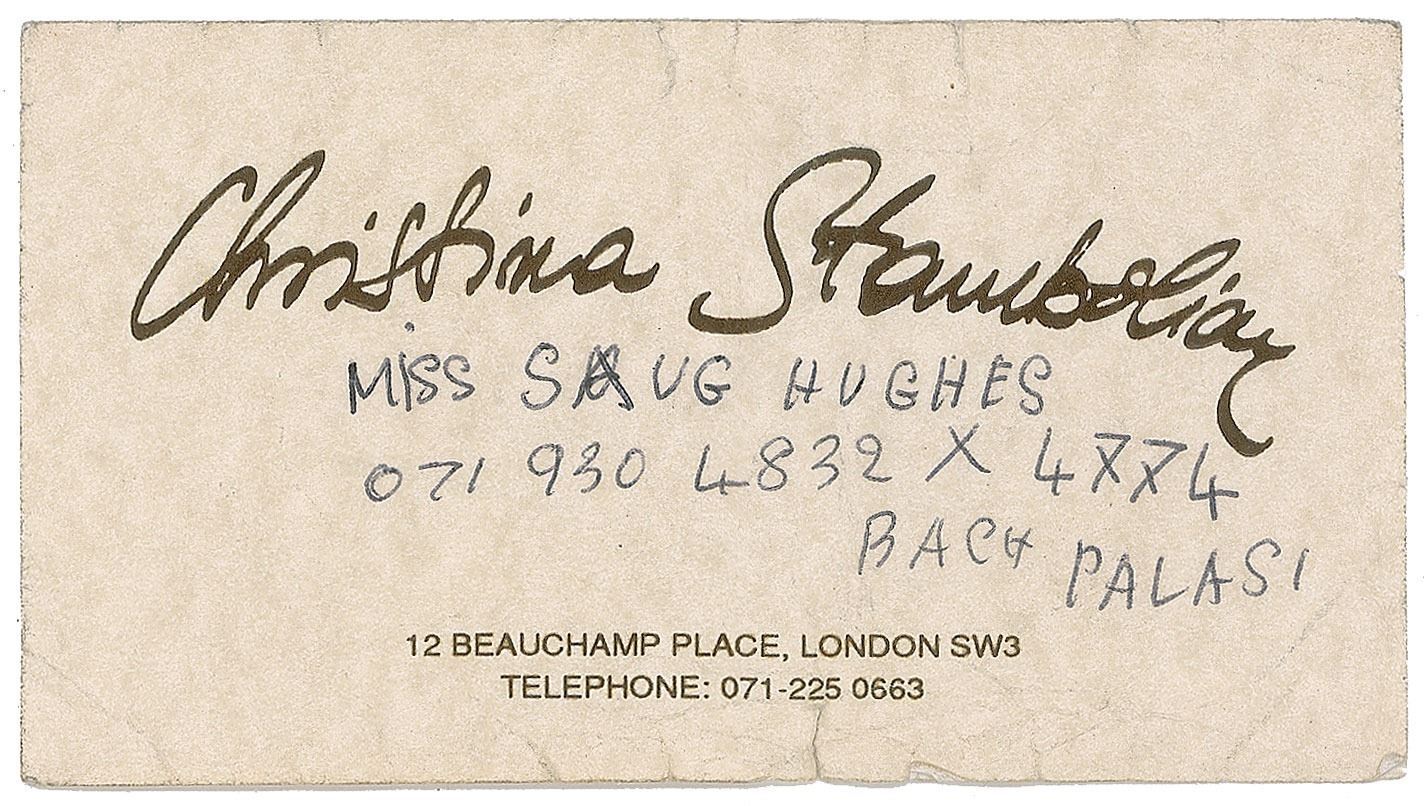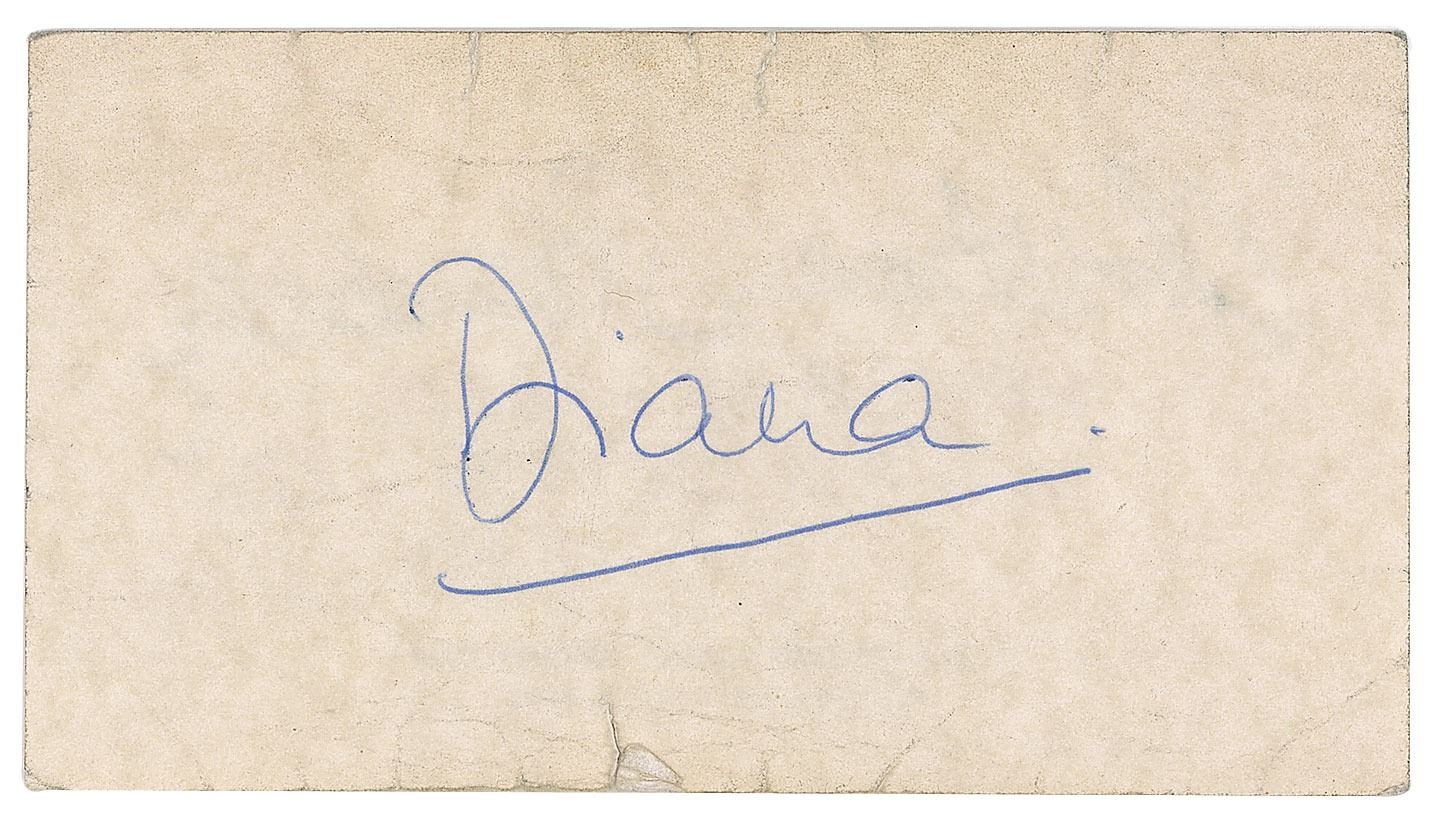 Blue ballpoint signature, "Diana,” on an off-white 5 x 2.75 business card belonging to fashion designer Christina Stambolian. In very good condition, with overall creasing, soiling, and short edge tears. Accompanied by a letter of provenance from the original recipient: "[Diana] gave this to me when I used to work in Knightsbridge, when I was a dressmaker for the designer Christina Stambolian. I made for her the black dress, which went on to become known as the revenge dress within the media. I asked her if I could have an autograph, she said that usually she doesn't do it but for me she would as it was just us in the shop at the moment. The first thing she could grab was Christina's business card, and so that's what she wrote it on. She said that if I needed help or saw a dress she liked to contact the number on the back of the card and the man there would help me. She was so kind and gentle when giving the signature I had never met a customer so kind, I didn't think for a second that she was a Princess."