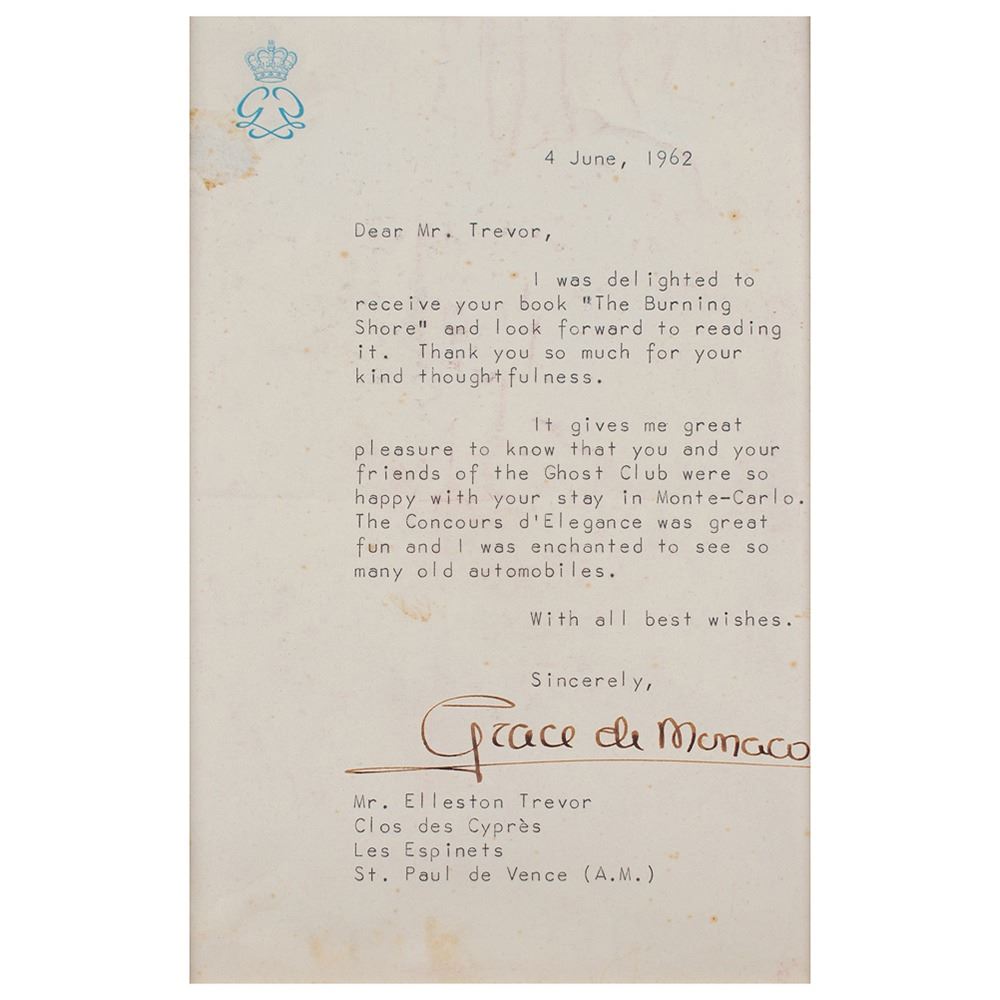 TLS signed ‰ÛÏGrace de Monaco,‰Û one page, 5 x 8, personal letterhead, June 4, 1962. Letter to British novelist Elleston Trevor, in full: "I was delighted to receive your book 'The Burning Shore' and look forward to reading it. Thank you so much for your kind thoughtfulness. It gives me great pleasure to know that you and your friends of the Ghost Club were so happy with your stay in Monte-Carlo. The Concours d'Elegance was great fun and I was enchanted to see so many old automobiles." Matted to an overall size of 8 x 10. In very good condition, with scattered light foxing, staining, and creasing, and an area of surface loss to the upper left edge.