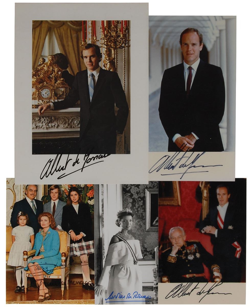 Grouping of five signed photos: a color semi-glossy 4 x 6 postcard of Grace Kelly and Prince Rainier posing with their children, signed in black felt tip, “Grace de Monaco,” and by Rainer in fountain pen, “Rainier, Prince de Monaco”; a glossy 3.75 x 5.75 three-quarter-length photo of the Princess of Hanover as a young woman, signed in blue felt tip, “Caroline de Monaco”; and three glossy and semi-glossy photos of Prince Albert, ranging in size from 4 x 5.75 to 5.75 x 8.25, each signed in black felt tip, “Albert de Monaco.” In overall fine condition.