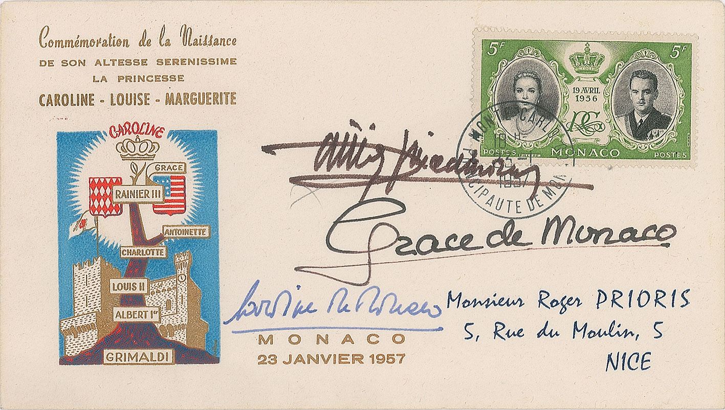 Commemorative cover, 6.5 x 3.75, with a color cachet honoring the birth of Princess Caroline Louise Marguerite on January 23, 1957, signed in black felt tip, "Grace de Monaco" and "Rainier, Prince de Monaco," and in blue ink, "Caroline de Monaco." In fine condition.