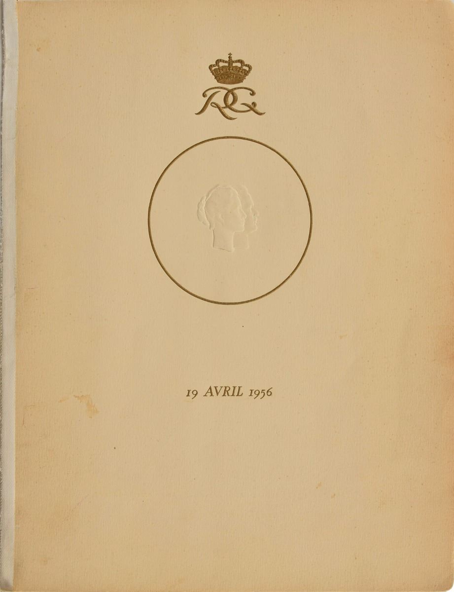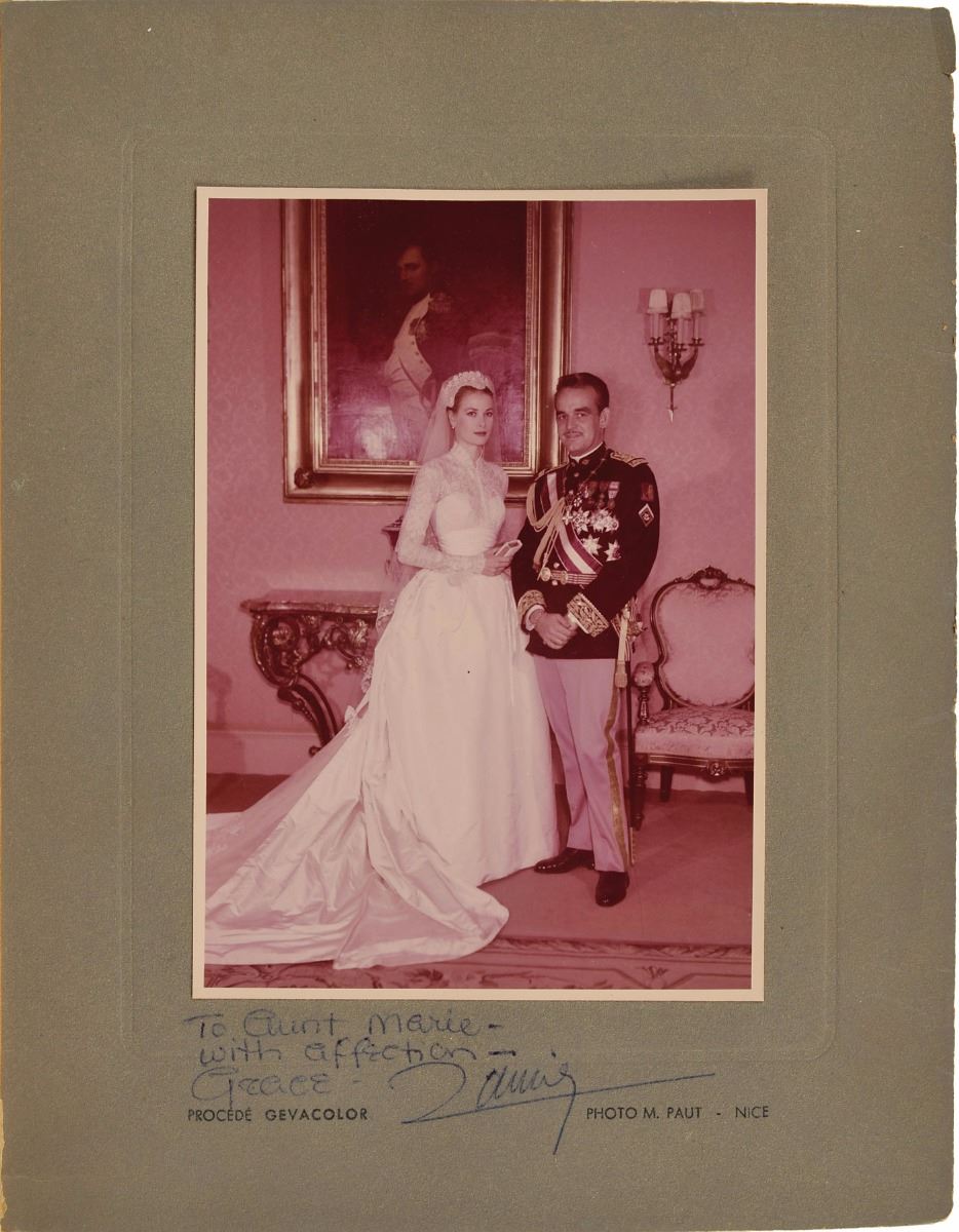 Color glossy 4.75 x 7 full-length portrait of the newly wedded royal couple, affixed to its original 8.25 x 10.5 M. Paut studio mount, signed and inscribed on the mount in black ink, "To Aunt Marie—with affection—Grace—" and "Rainier.” Housed in the original royal presentation folder with embossed monogram and date, "10 April 1956." In very good to fine condition, with light soiling to the covers and a strip of archival tape along the hinge.
