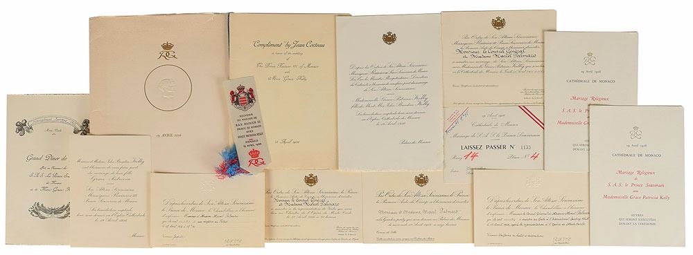 Group of ephemera related to the wedding of Grace Kelly and Prince Rainier of Monaco on April 19, 1956, including: a silk wedding souvenir; a wedding ticket stub; two wedding programs; invitations for pre-wedding festivities; a program containing a "'Compliment' by Jean Cocteau" poem in honor of the wedding, dated April 15, 1956; a menu from a pre-wedding dinner at the International Sporting Club on April 15, 1956; and a limited edition program for the events honoring the marriage at the Opera de Monte-Carlo on April 18, 1956. In overall fine condition. Consignor notes that this collection originates from the estate of Marcel Palmaro, Monaco's consul general to the US.