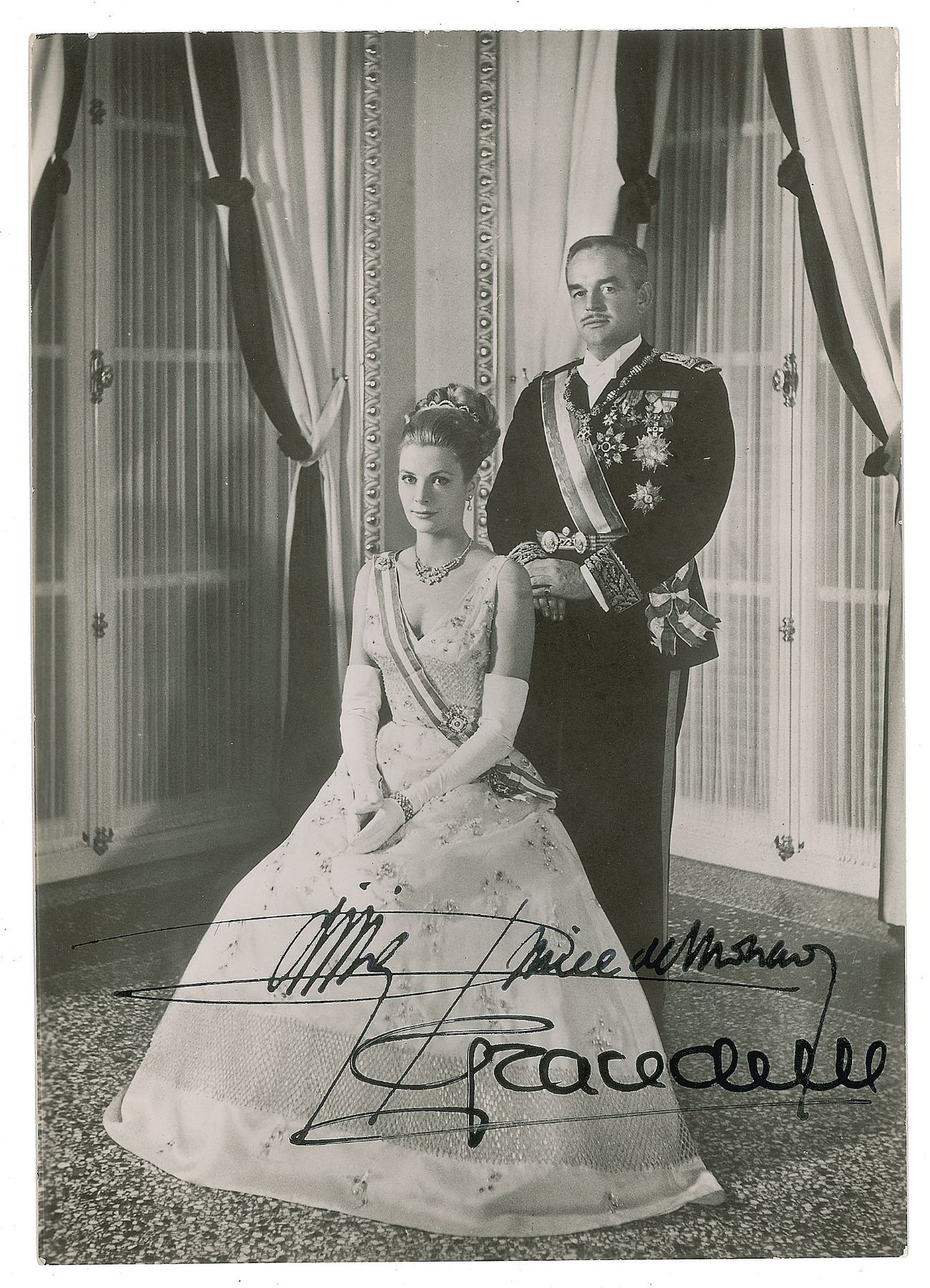 Vintage glossy 4 x 6 postcard photo of the royal couple, signed in black felt tip, "Grace de M." and "Rainier, Prince de Monaco." In fine condition. Accompanied by the original mailing envelope, postmarked in 1966.