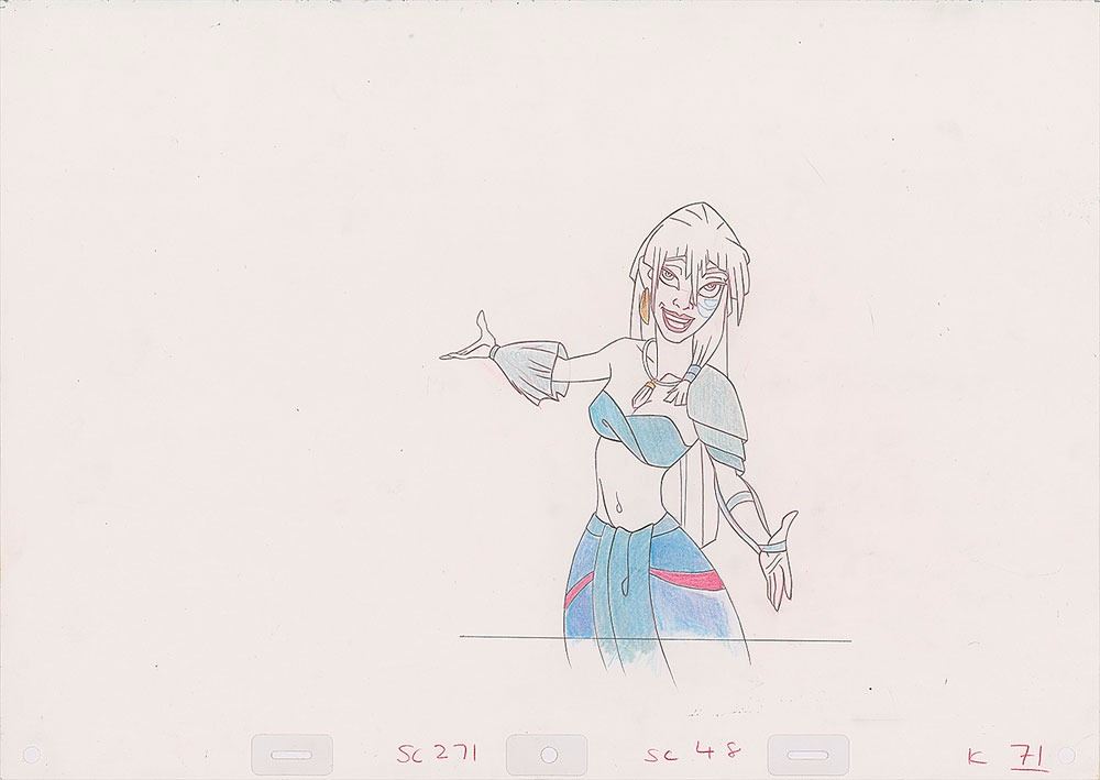 (Walt Disney Studios, 2001) Original production drawing of Princess Kida from Atlantis: The Lost Empire, showing her with her arms open. Accomplished in graphite and colored pencil on a sheet of 17 x 12 animation paper. In fine condition.