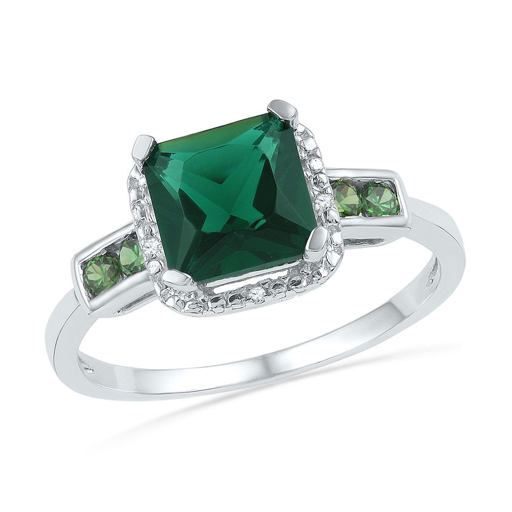 Sterling Silver Womens Princess Lab-Created Emerald Solitaire Diamond-accent Ring 2-1/5 Cttw