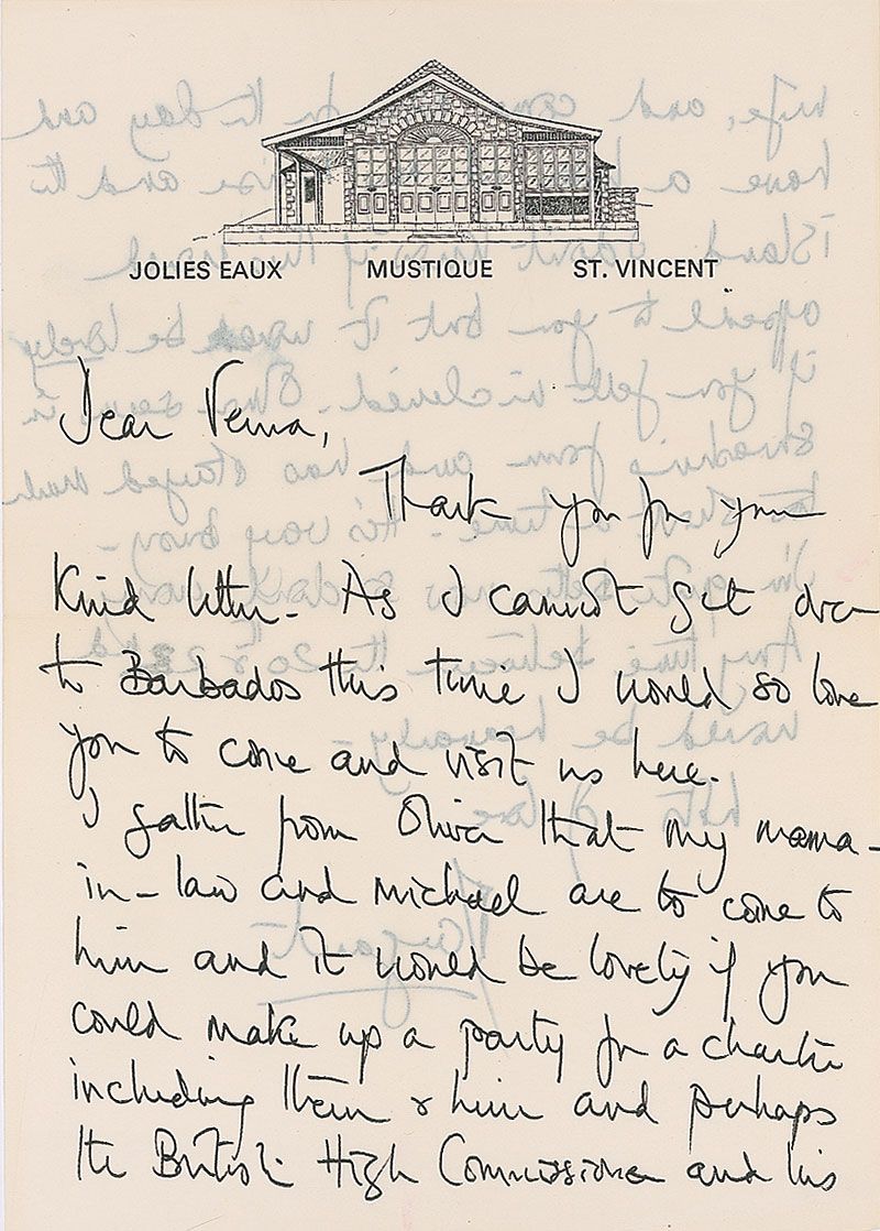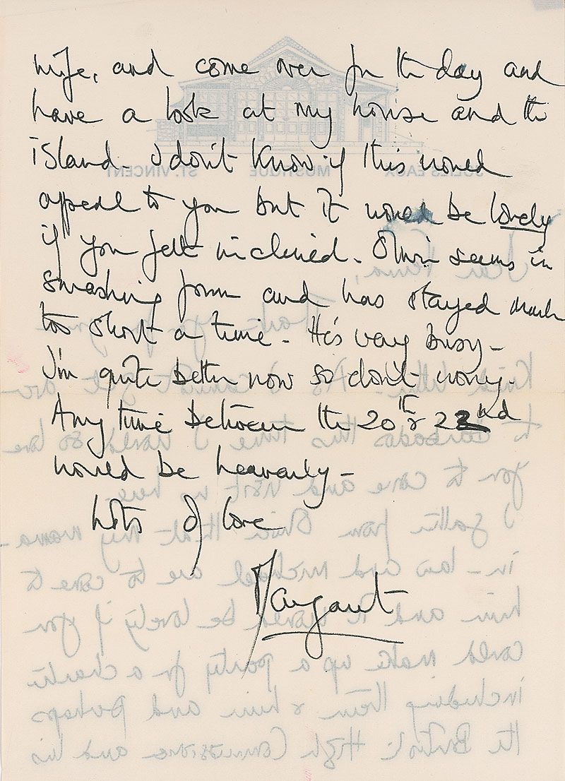 ALS signed “Margaret,” one page both sides, 5.75 x 8, personal letterhead, no date. Letter to a friend. In part: “As I cannot get over to Barbados this time I would so love you to come and visit us here…it would be lovely if you could make up a party for a charter…and come over for the day and have a look at my house and the island.” In fine condition, with slight brushing to a couple words. Accompanied by the original transmittal envelope, addressed in Margaret’s hand.