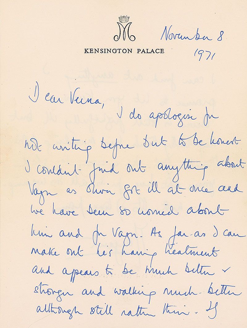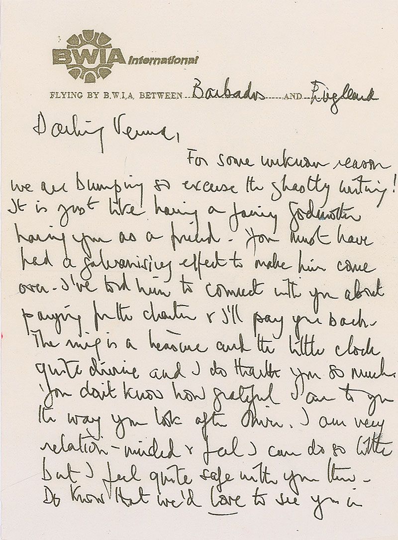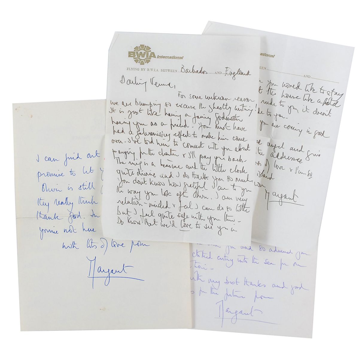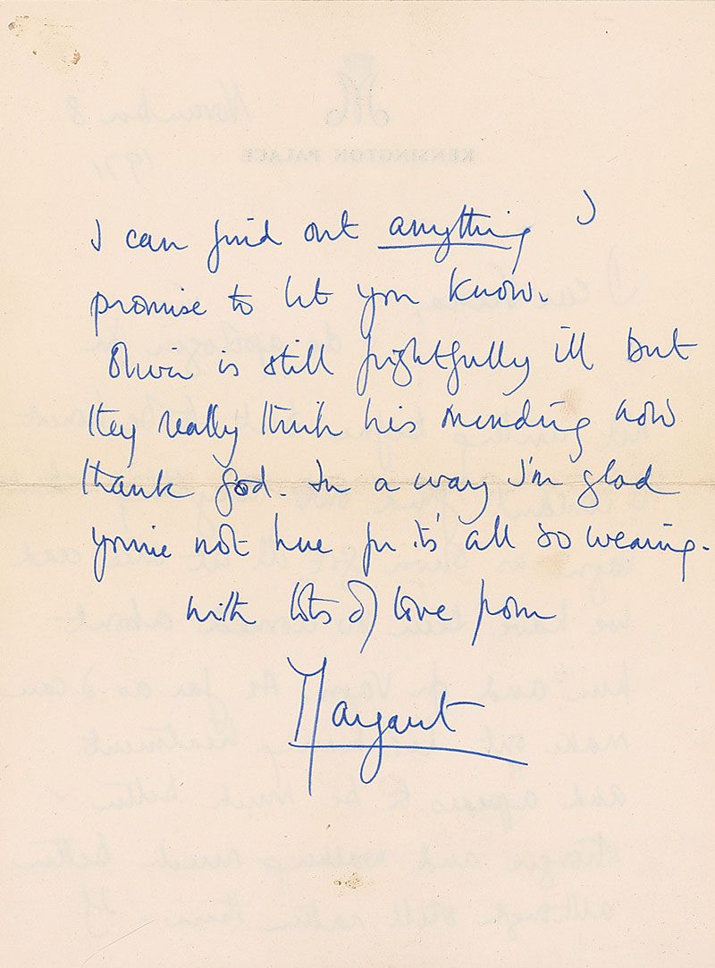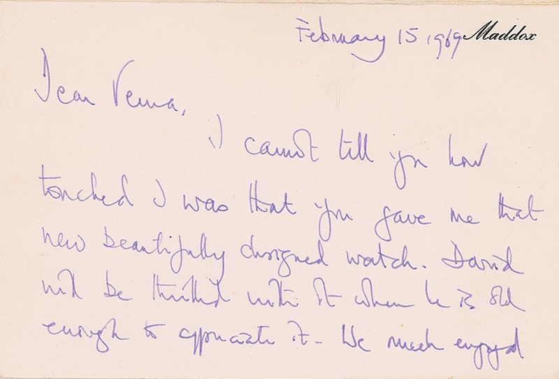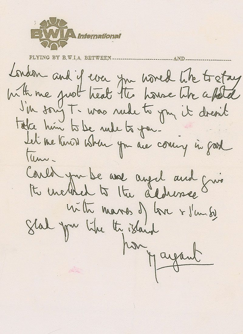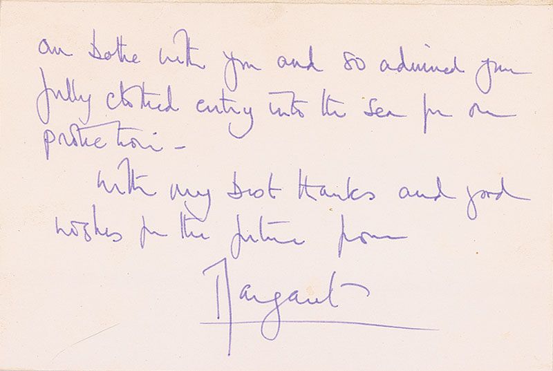 Three ALSs, all signed “Margaret,” various lengths, all to Verna Hull, dating from 1969–1975. One letter from 1969 reads: “I cannot tell you how touched I was that you gave me that new beautifully designed watch. David will be thrilled with it when he is old enough to appreciate it. We much enjoyed our bathe with you and so admired your fully clothed entry into the sea for our protection.” In overall fine condition. Each letter is accompanied by its original transmittal envelope. Also included is an unsigned telegram, stamp-dated December 17, 1974.