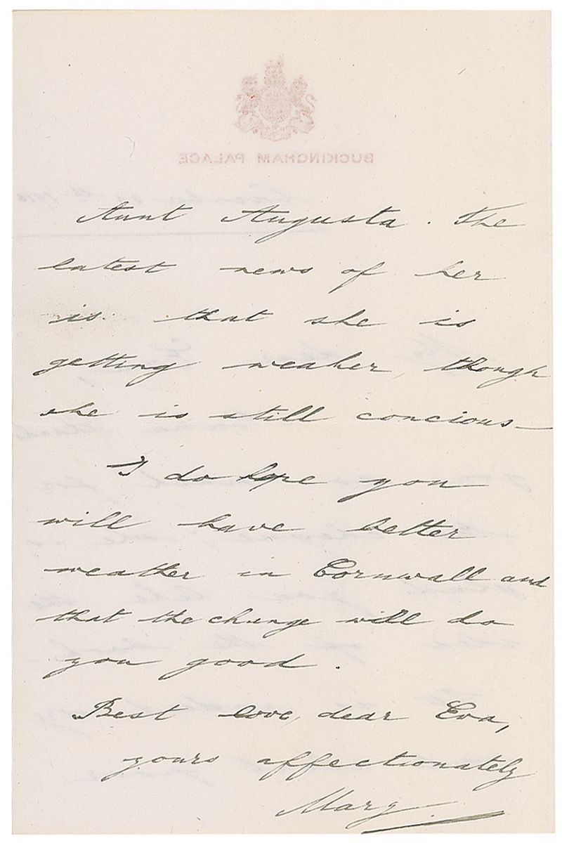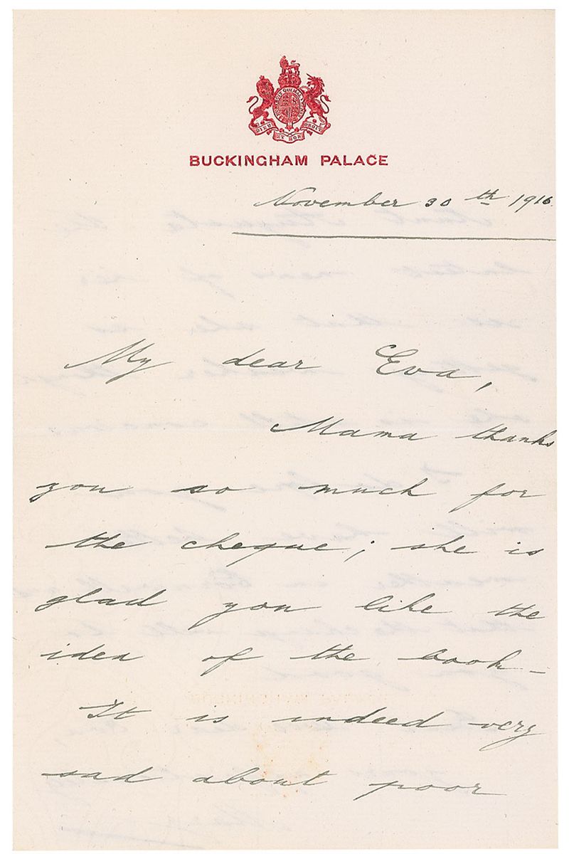 Daughter of King George V and Queen Mary (1897–1965). ALS signed “Mary,” one page both sides, 4.75 x 7.25, Buckingham Palace letterhead, November 30, 1916. Letter to Eva. In part: “Mama thanks you so much for the cheque; she is glad you like the idea of the book. It is indeed very sad about poor Aunt Augusta [Princess Augusta of Cambridge, granddaughter of King George III]. The latest news of her is that she is getting weaker though she is still conscious.” In fine condition. Six British monarchs reigned during Princess Mary's lifetime: Queen Victoria (her great-grandmother), Edward VII (her grandfather), George V (her father), Edward VIII and George VI (her brothers), and Elizabeth II (her niece).