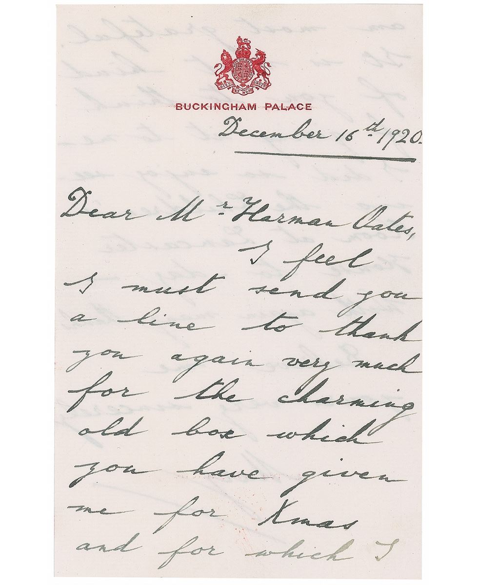 ALS signed “Mary,” one page both sides, 4.75 x 7.5, Buckingham Palace letterhead, December 16, 1920. Letter to Harman Oates, in full: “I feel I must send you a line to thank you again very much for the charming old box which you have given me for Xmas and for which I am most grateful. It is most kind of you to think of giving it to me—I did so enjoy seeing the Children’s Room at Lancaster House to–day.” In fine condition, with trivial mirroring to lower portion from embossed red letterhead. Accompanied by the original mailing envelope, addressed in her own hand.