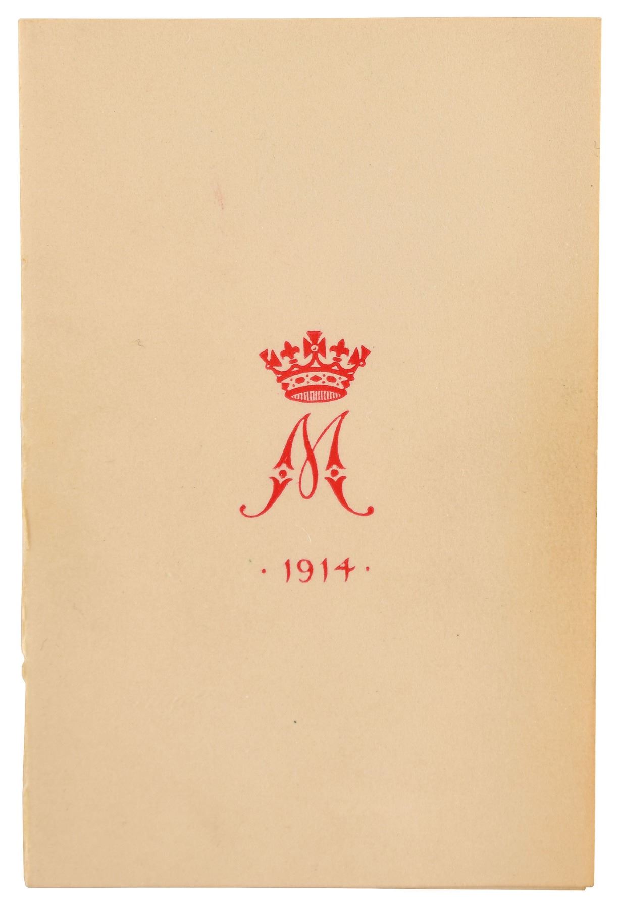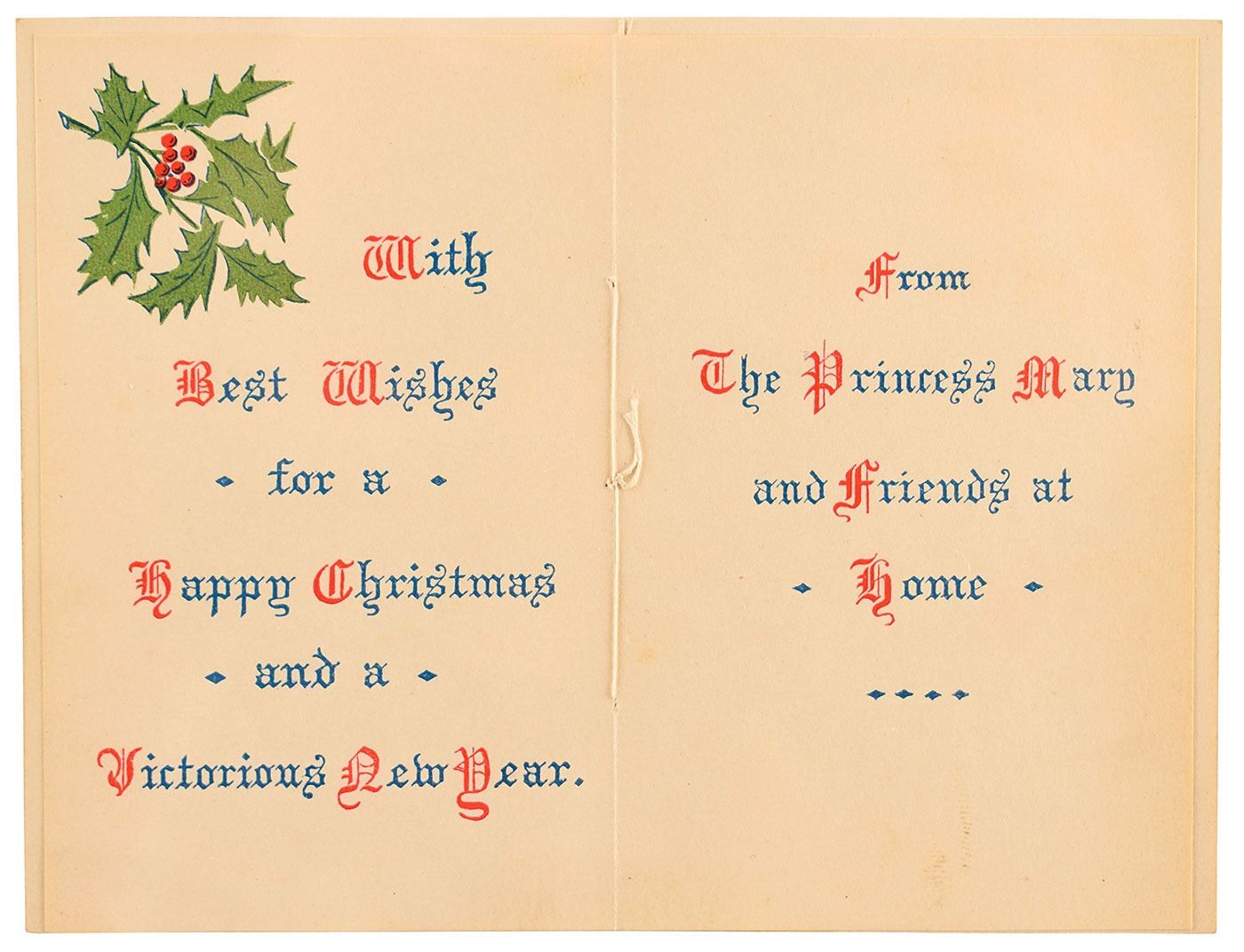 Princess Mary's charitable Christmas gift to British troops at the outset of World War I in 1914, featuring a decorative gilt tin containing a sealed pouch of tobacco, an opened pack of 18 rolled cigarettes, a .303 cartridge-shaped pencil, and a Christmas card with a small portrait of the princess. The yellow tobacco and cigarette packages are labeled, "Her Royal Highness The Princess Mary's Christmas Fund, 1914." In fine condition. In 1914, the 17-year-old Princess Mary began a public fund to support Christmas gifts to be distributed to 'every sailor afloat and every soldier at the front' in the First World War. Her charitable efforts were wildly successful, and her call for donations ultimately yielded the astonishing sum of £162,591. The gift boxes were distributed over the course of the next three years, and brought welcome comforts of home to the men at the front.