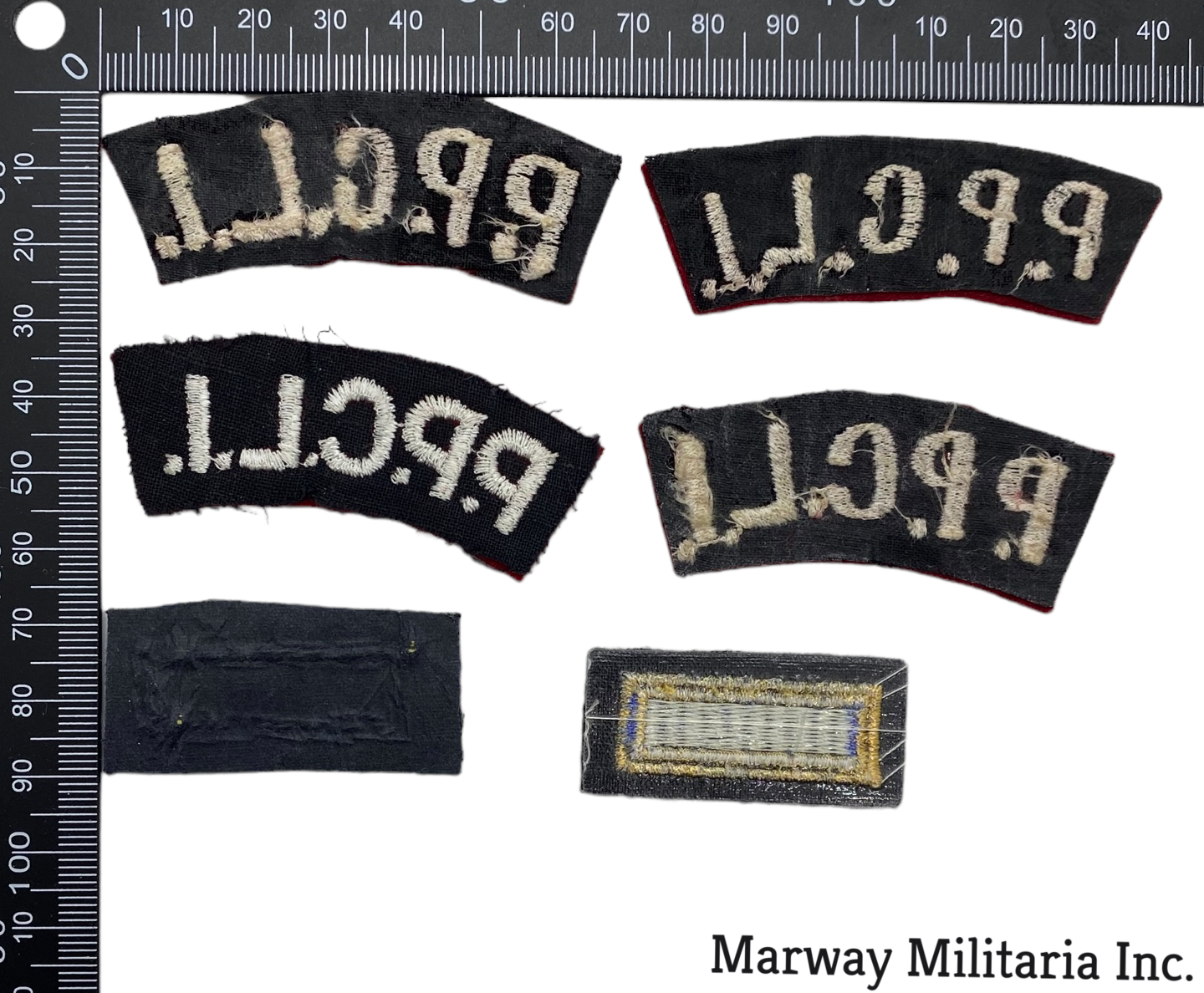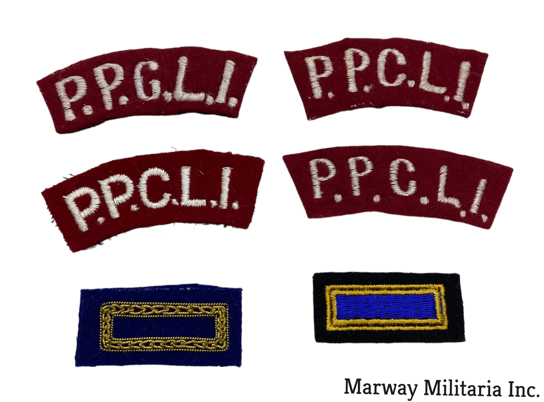 PPCLI. Lot of 6. Lot of 4 white on red shoulder flashes, two different citations "swimming pools", one all embroidered, other with gold wire.