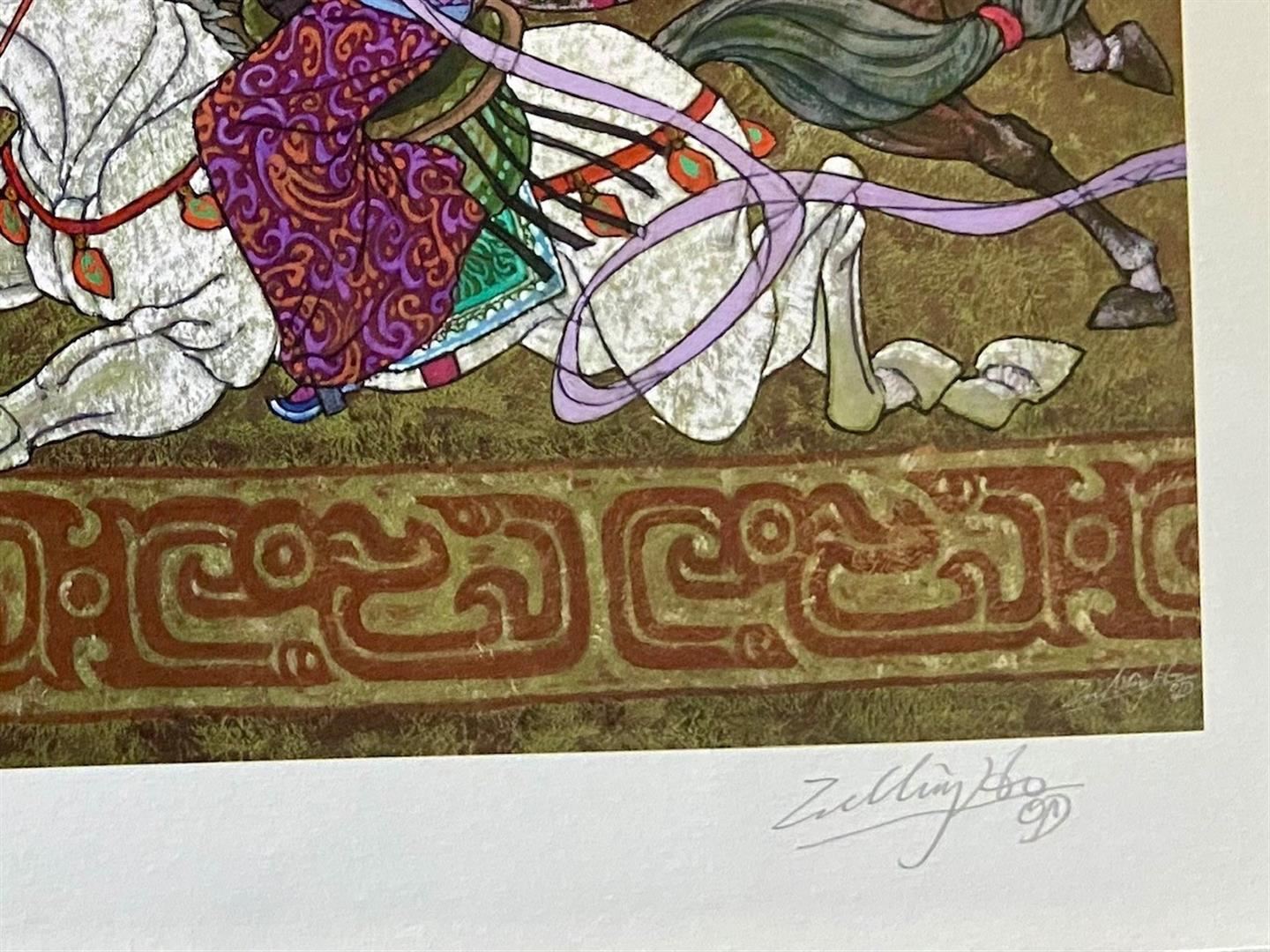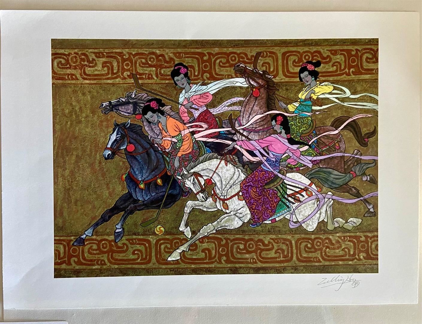 A signed, unnumbered 1/I Unique giclee on paper by renowned Chinese-American artist Zu Ming Ho shows us a Royal Polo match by Ming Dynasty Princesses, all the rage at the time. It is 16.5x11.37"