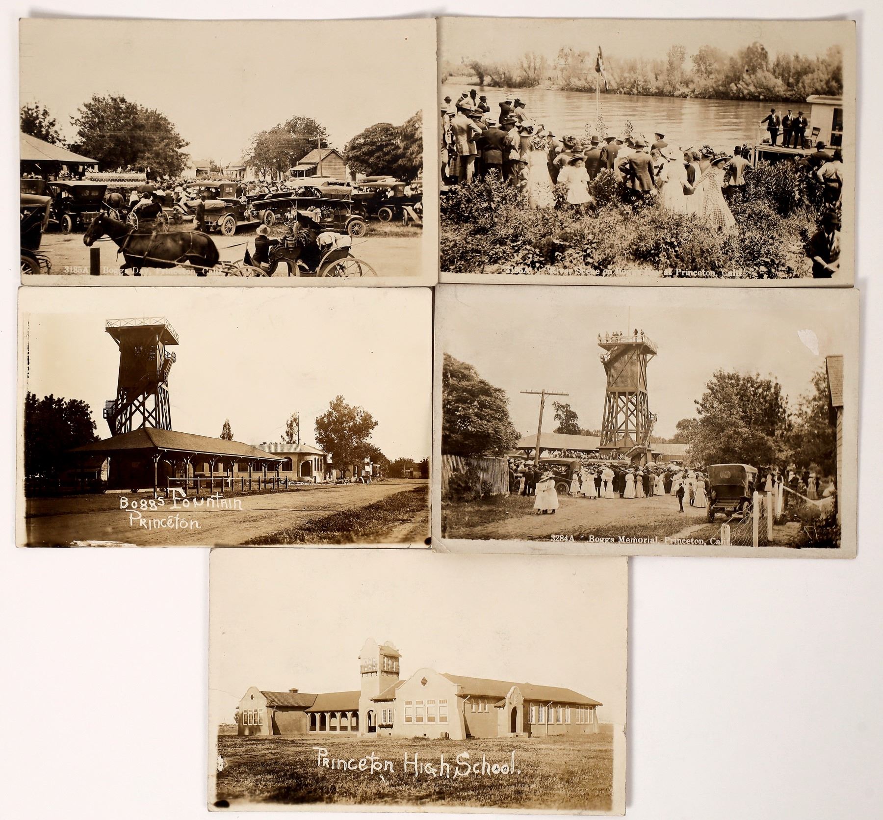 Lot of 5. Real Photo and post cards. Post marks" Colusa. Street level views: High schools, crowd gathered at the Sacto river, Boggs Fountain, Bogg's memorial, cars-buggies and crowd. California Princeton 1912-19 Ken Prag Collection