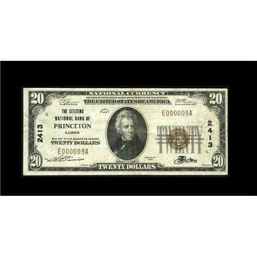 <B>Princeton, IL</B></I> - $20 1929 Ty. 1 <B>The Citizens NB</B></I> Ch. # 2413<BR>Serial number 9 adorns this bright note with uniform wear. <B>Very Fine.</B></I>