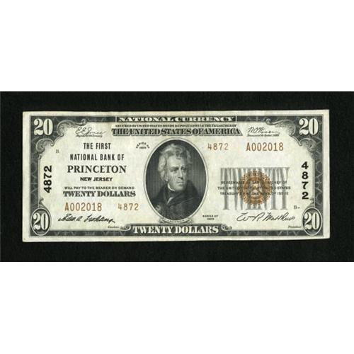 <B>Princeton, NJ</B></I> - $20 1929 Ty. 2 <B>The First NB</B></I> Ch. # 4872<BR> A bright, well margined example from this popular town, home to the Ivy League university of the same name. <B>Extremely Fine</B></I>.<BR><I>From The John Ameen Collection</B></I><BR><BR><b>Shipping:</b> Coins & Currency (<a target="_blank" href="http://www.heritageauctions.com/common/shipping.php">view shipping information</a>)