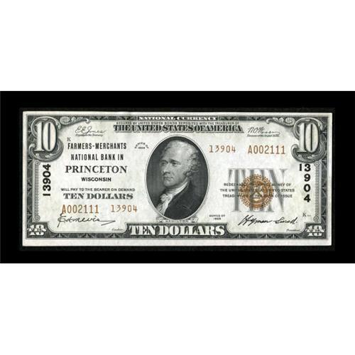 <B>Princeton, WI</B></I> - $10 1929 Ty. 2 <B>Farmers-Merchants NB</B></I> Ch. # 13904<BR> A fresh and attractive piece with just enough handling to remove it from the gem category. <B>Choice Crisp Uncirculated.</B></I><BR><BR><b>Shipping:</b> Coins & Currency (<a target="_blank" href="http://www.heritageauctions.com/common/shipping.php">view shipping information</a>)