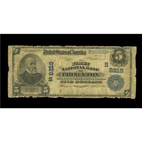 <B>Princeton, WV</B></I> - $5 1902 Plain Back Fr. 599 <B>The First NB</B></I> Ch. # (S)8219<BR>You can chalk this $5 with serial number 10199 up for the census that previously stood at 10 large. <B>Good-Very Good.</B></I>