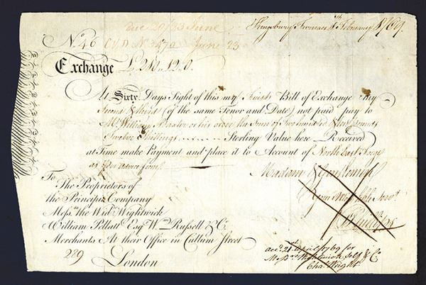 Kingsbury Furnace, MD. 1769. 280 Pounds Stlg, 12 Shillings, 1st of Exchange, for the account of North East Forge. William Russell, one of the founders of this early Colonial Maryland iron company is listed on the front of the exchange. Endorsed and signed on the back by W. Baxter, G. Russell, William Russell, Clark Dickinson and others. VF+ condition. Serial # 46. The Principio Company formed as a joint stock company in 1720 to take advantage of new laws passed in Maryland to encourage the early iron industry. By 1729, one of the partners was Augustine Washington, father of George Washington. In 1735, the Principio Company established a refining forge at North East to expand processing capacity which this bill of exchange refers to. The Principio Forge deteriorated, and in spite of repairs in 1772, it was no longer in operation by 1776. Historic Maryland Iron Company Bill of Exchange.