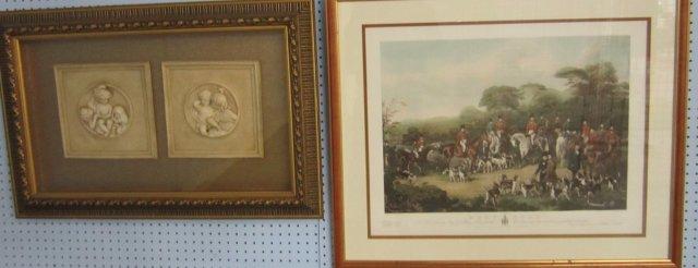1- "The Hunt", print, approx. 22" x 28". 2- Plaques in a gilt frame, approx. 18" x 28". Please read our terms of sale.