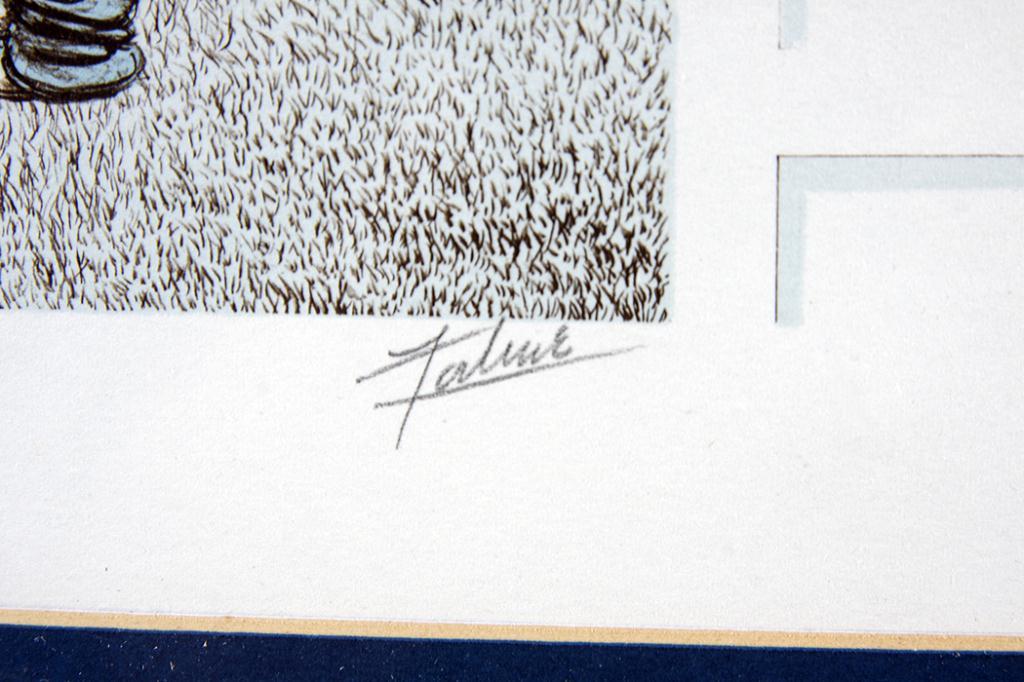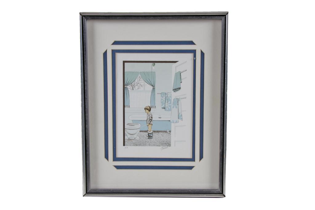 Print Depicting a Small Boy in Bathroom Signed by Faline in lower right hand corner, double matted and framed, image size is 8"x11".Signed by Faline in lower right hand corner, double matted and framed, image size is 8"x11".