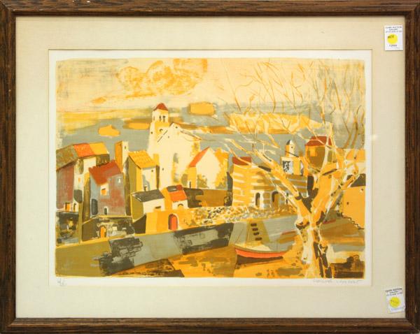 Framed color lithograph, French Village Scene, by Georges Lambert (French, 1919-1998), signed in pencil ''Georges Lambert'' lower right, numbered edition, overall: 24''h x 30''w