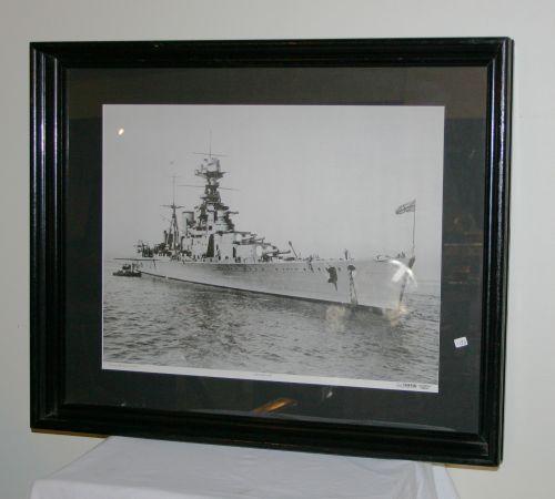 Nicely framed and matted photographic print under glass of the HMS Hood in 1931. Photograph © Ministry of Defence. Printed and published Plaistow Pictorial, London England. Approximately 25" x 31" framed.