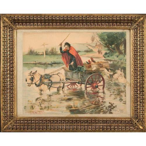 This is a very comical portrayal of a problem that was often faced by many farmers. The distraught expression on the woman?s face, combined with the seeming sluggish and careless expression of the mule is a classic example of comedy. Though a carefree style of picture, it is full of examples of artistic mastery and consideration. From the fine details to the brilliant composition, this picture is quiet remarkable. It is framed in an antique, decorative gold metal frame that accentuates the warm colors as well as fits the time period of the picture. This excellent print is 13? x 16? and is excellently priced.</font>