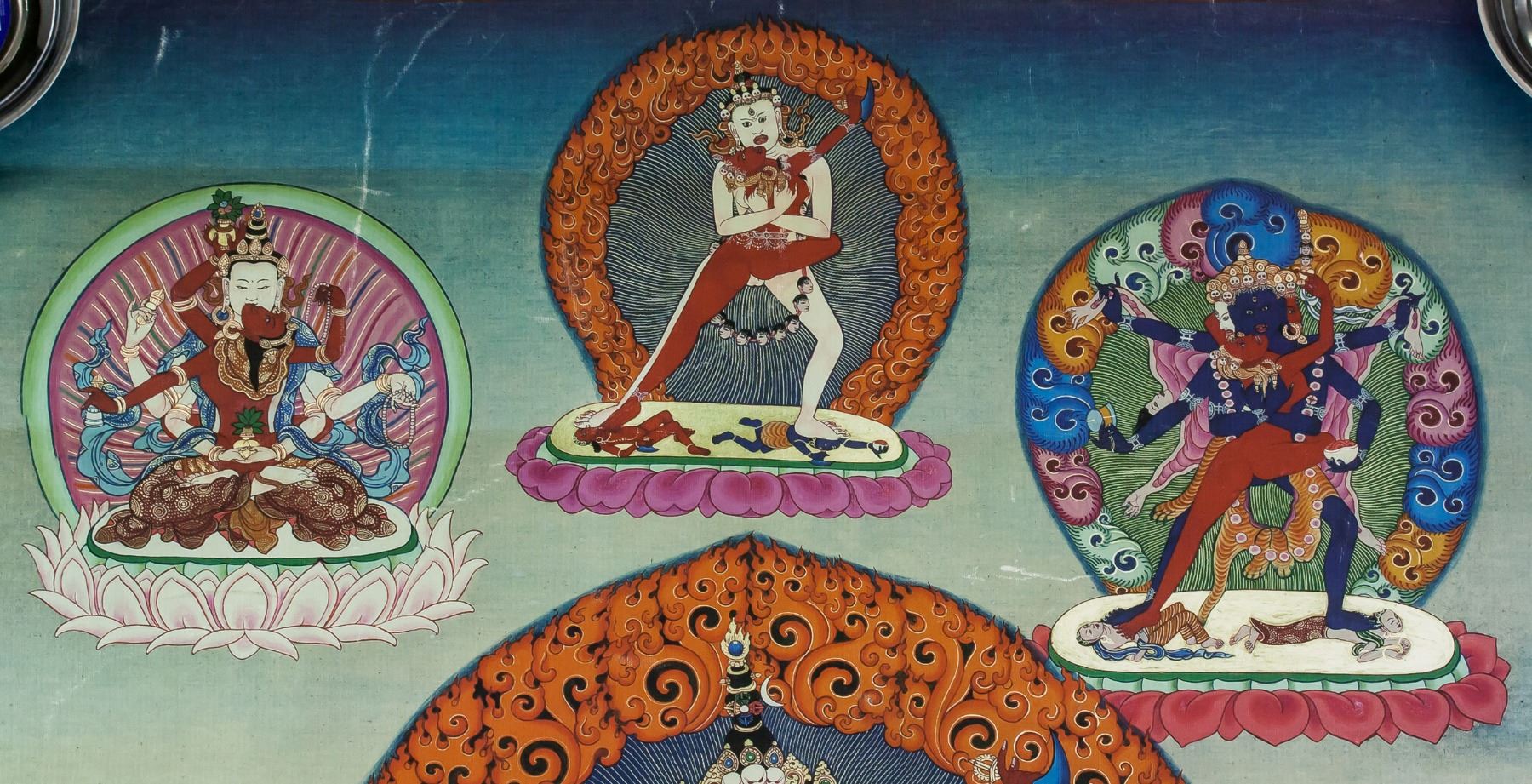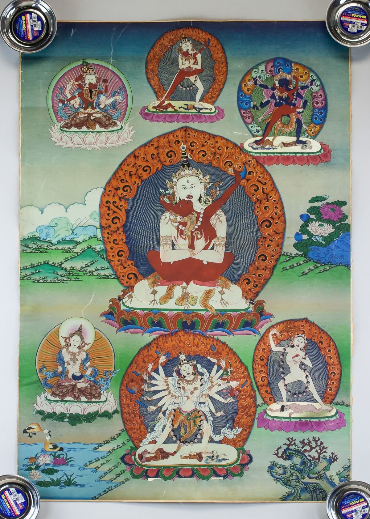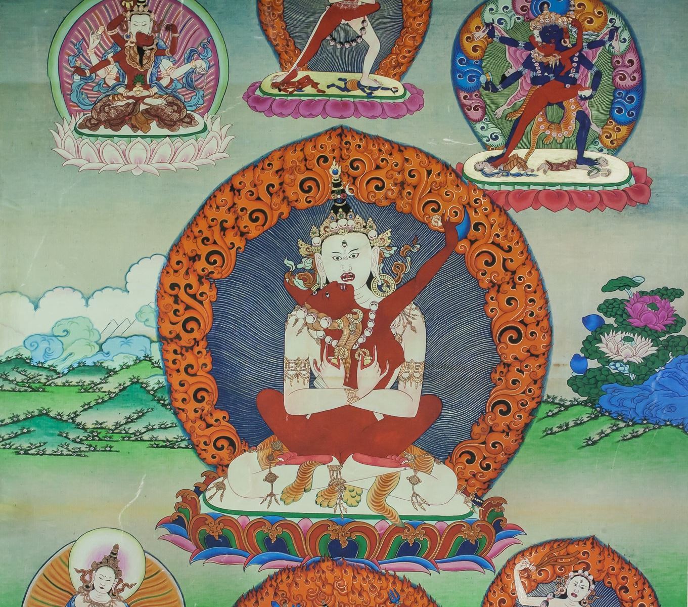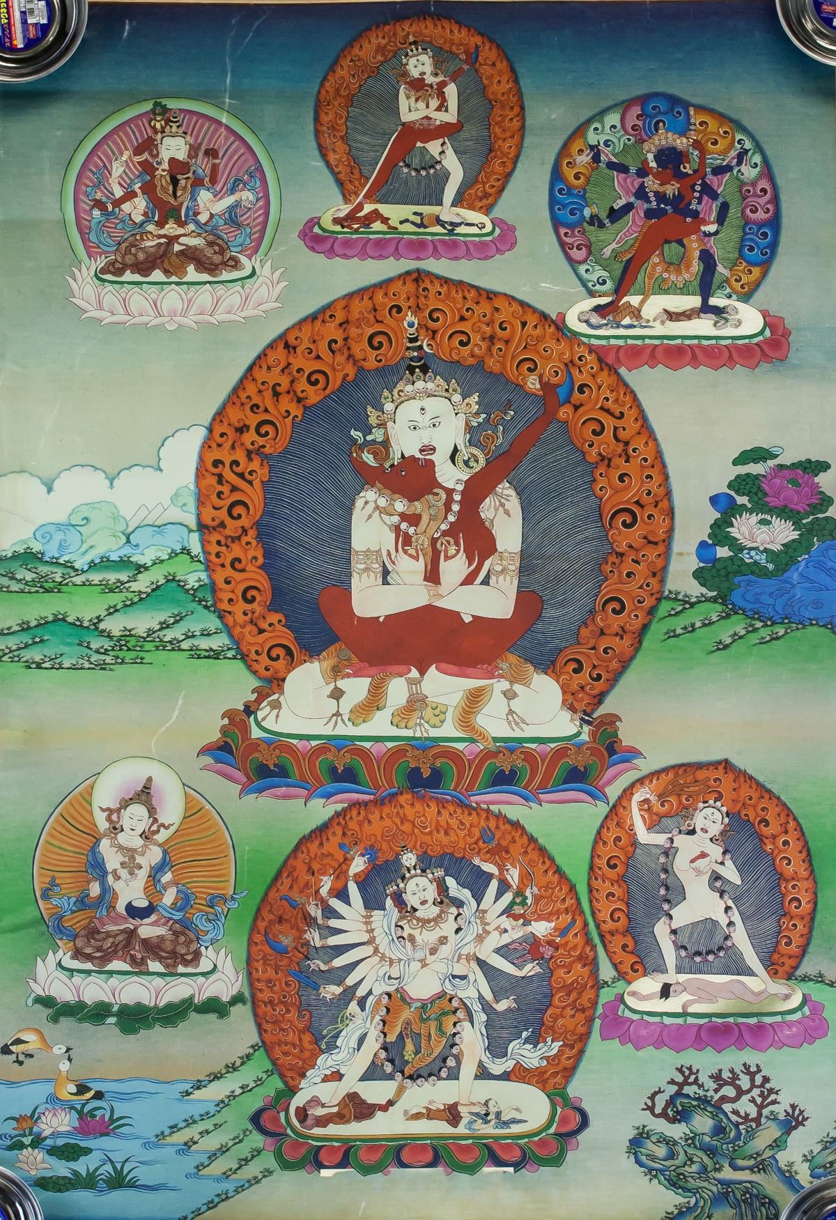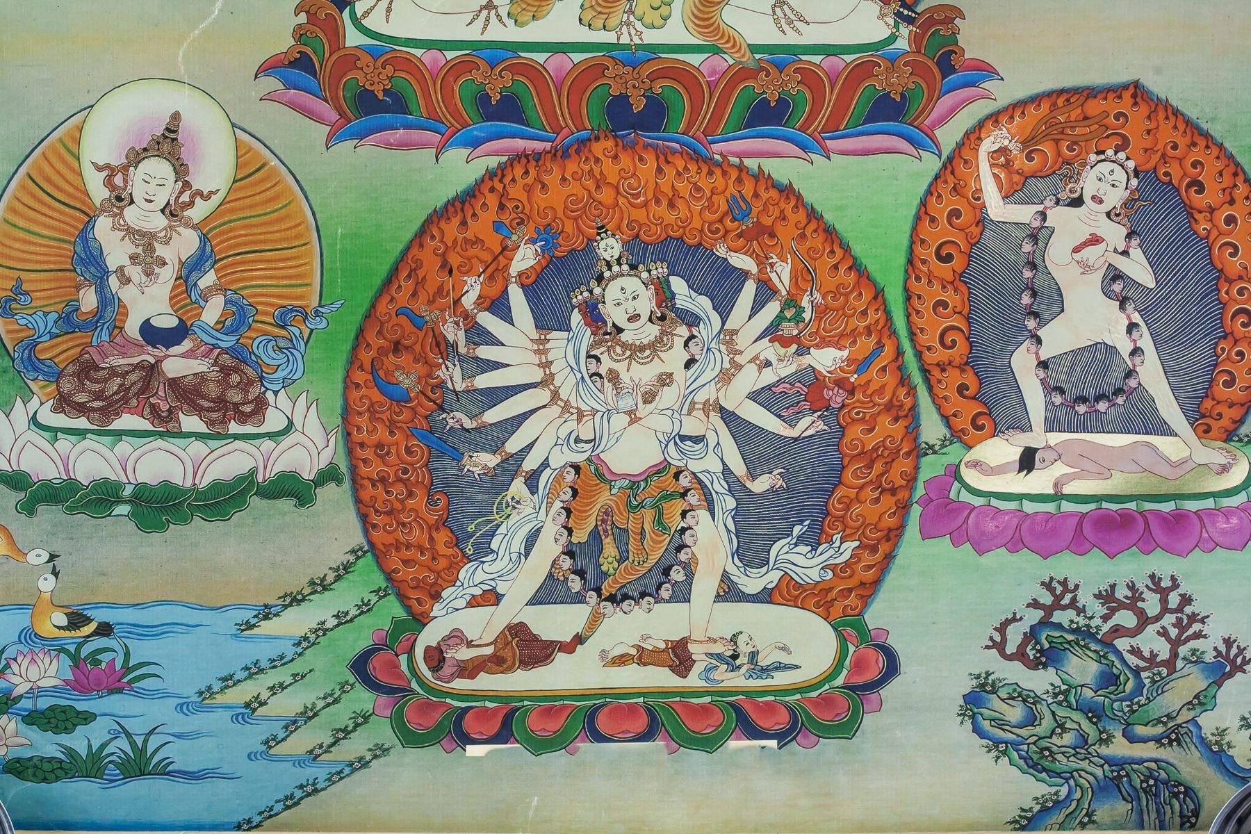 Print tanka (thangka) on canvas. Featuring seated protective deity. 88 x 69 cm