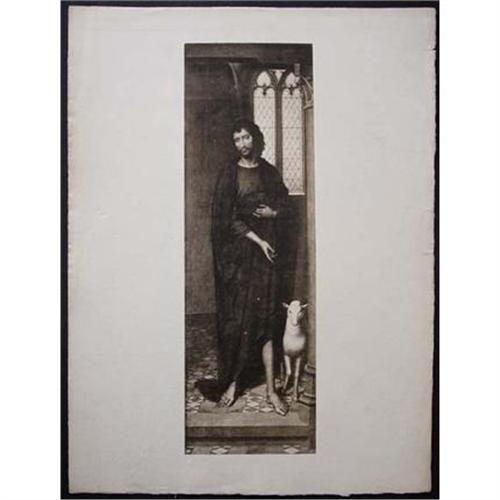 Elongated sepia color print after a panel of a triptych by Hans Memling (1433 - 1494). Printed on the reverse: "Hans Memling. Ne la mettons point en pieces, mais tirons au sort, pour savoir a qui la tunique sera." In good condition, as shown. Additional photos available upon request. Please send us an email before bidding with your state, country and zip code so we can estimate shipping charges to your location.