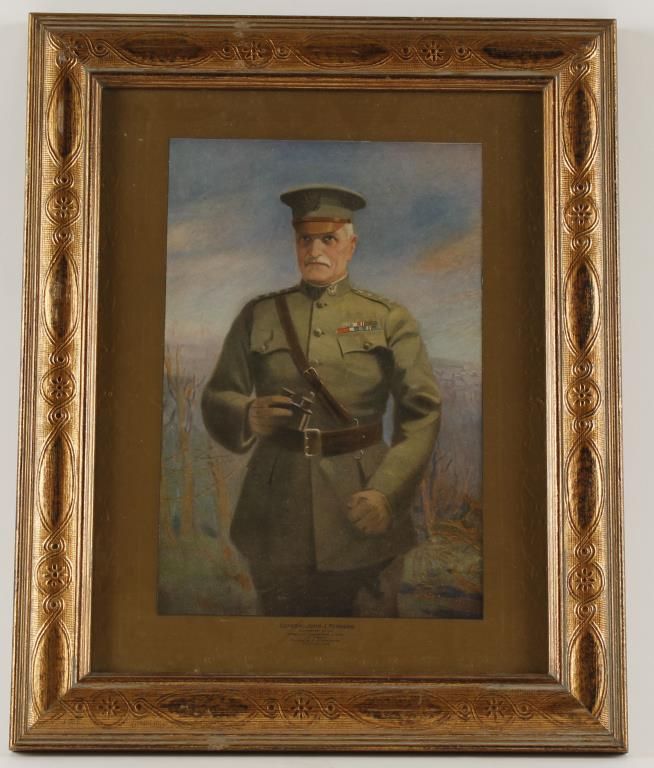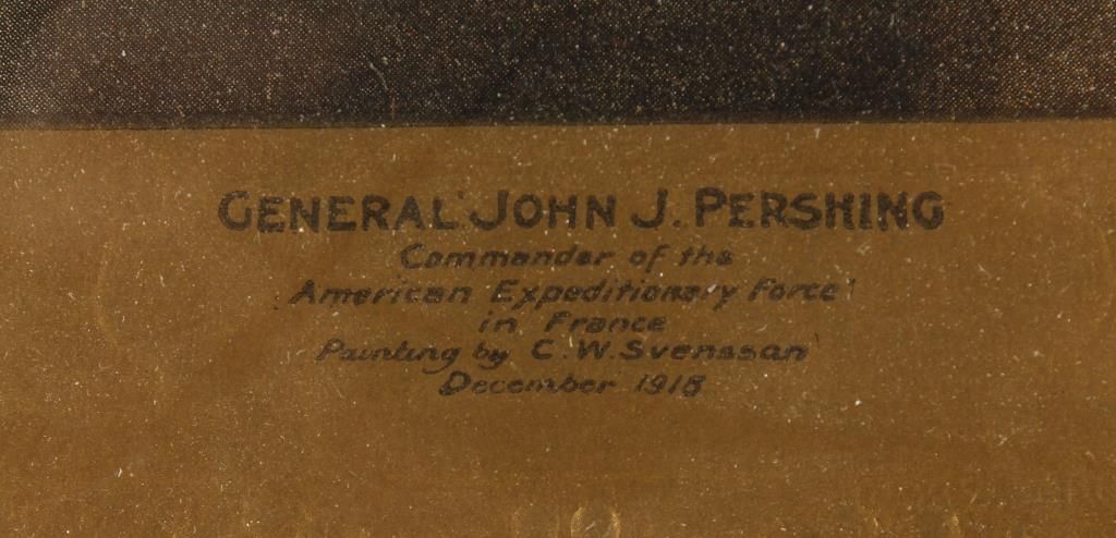 Dated December 1918. Depicting General John J. Perishing, commander of the American Expeditionary Force in France. Image size 7" x 10". Framed and matted. 12" x 15-3/4".