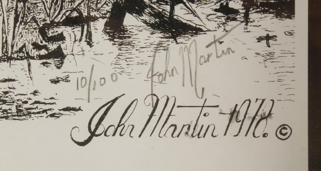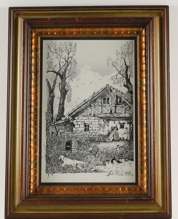 In black and white, depicting a country home. Pencil signed lower right, 10/100. Image size 11" wide x 17" high. Framed and matted 19-1/4" wide x 25" high.