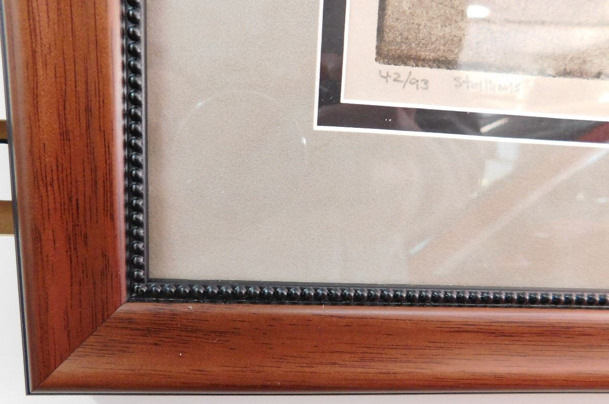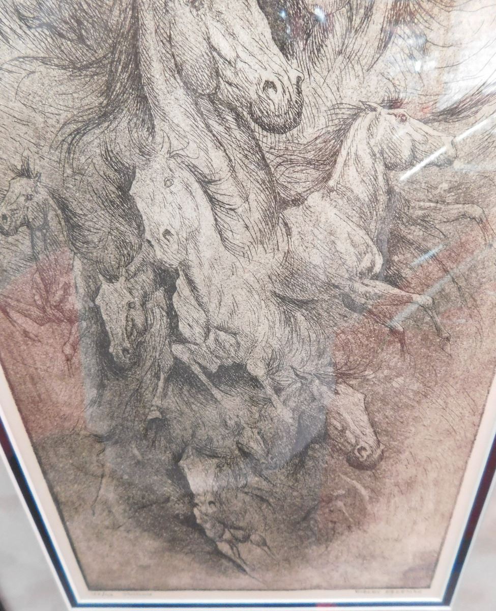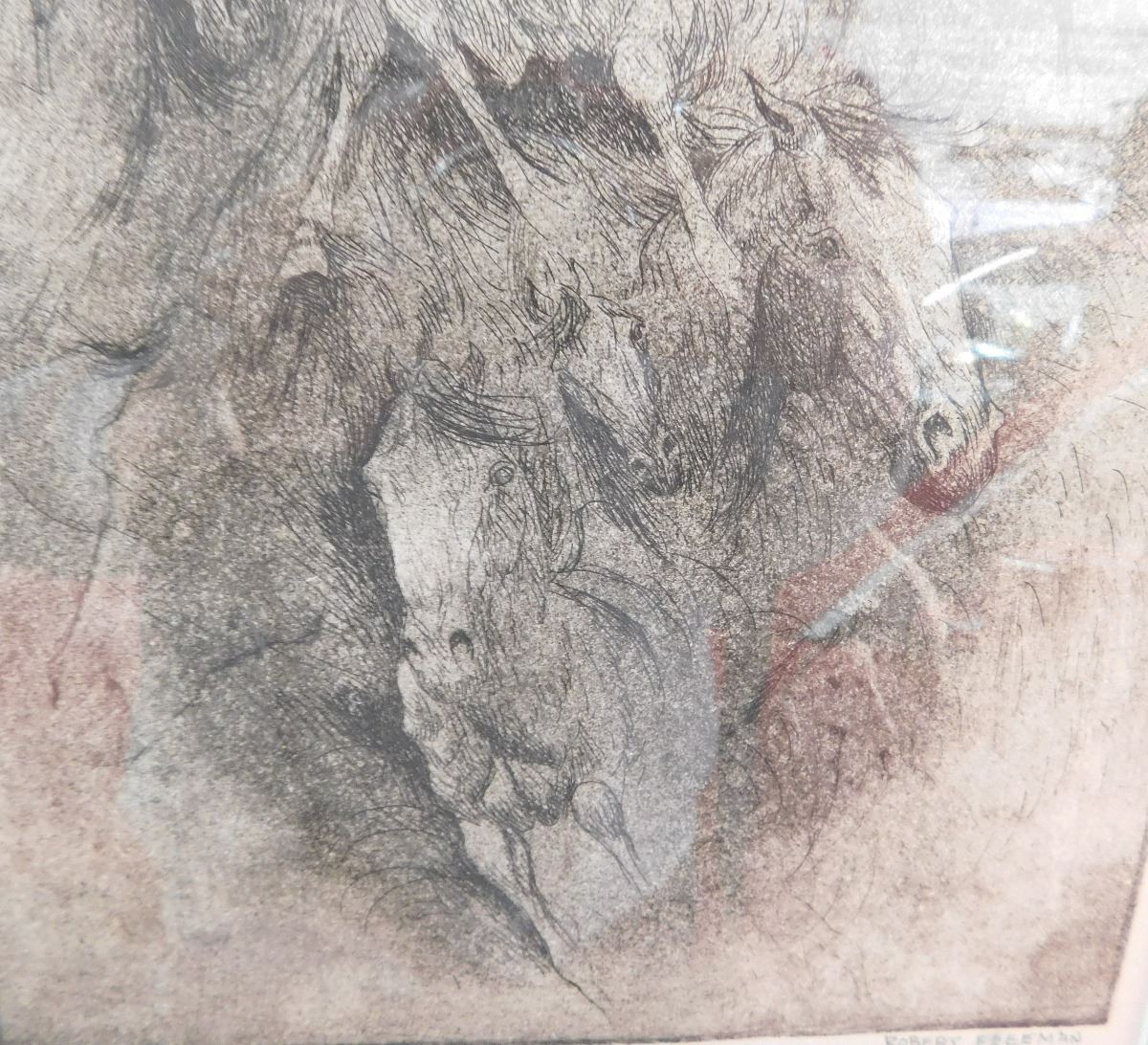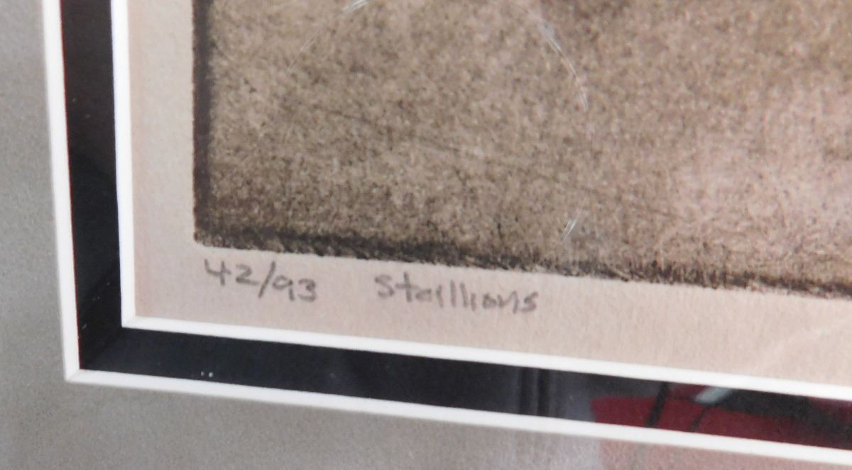 Print by Robert Freeman, signed and numbered. Artwork is beautifully matted and framed and measures 14" x 19.5" tall. The title of the picture is "Stallions" and it is no. 42 of 93. Condition: Very good condition, ready to hang, see images. Shipping: $26.50, must be double-boxed.